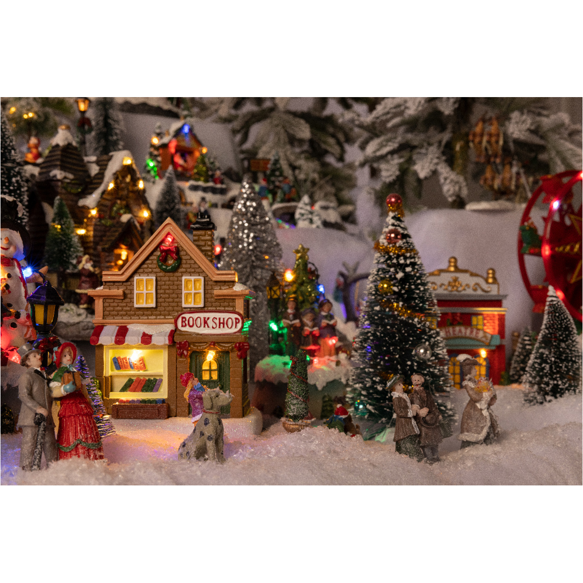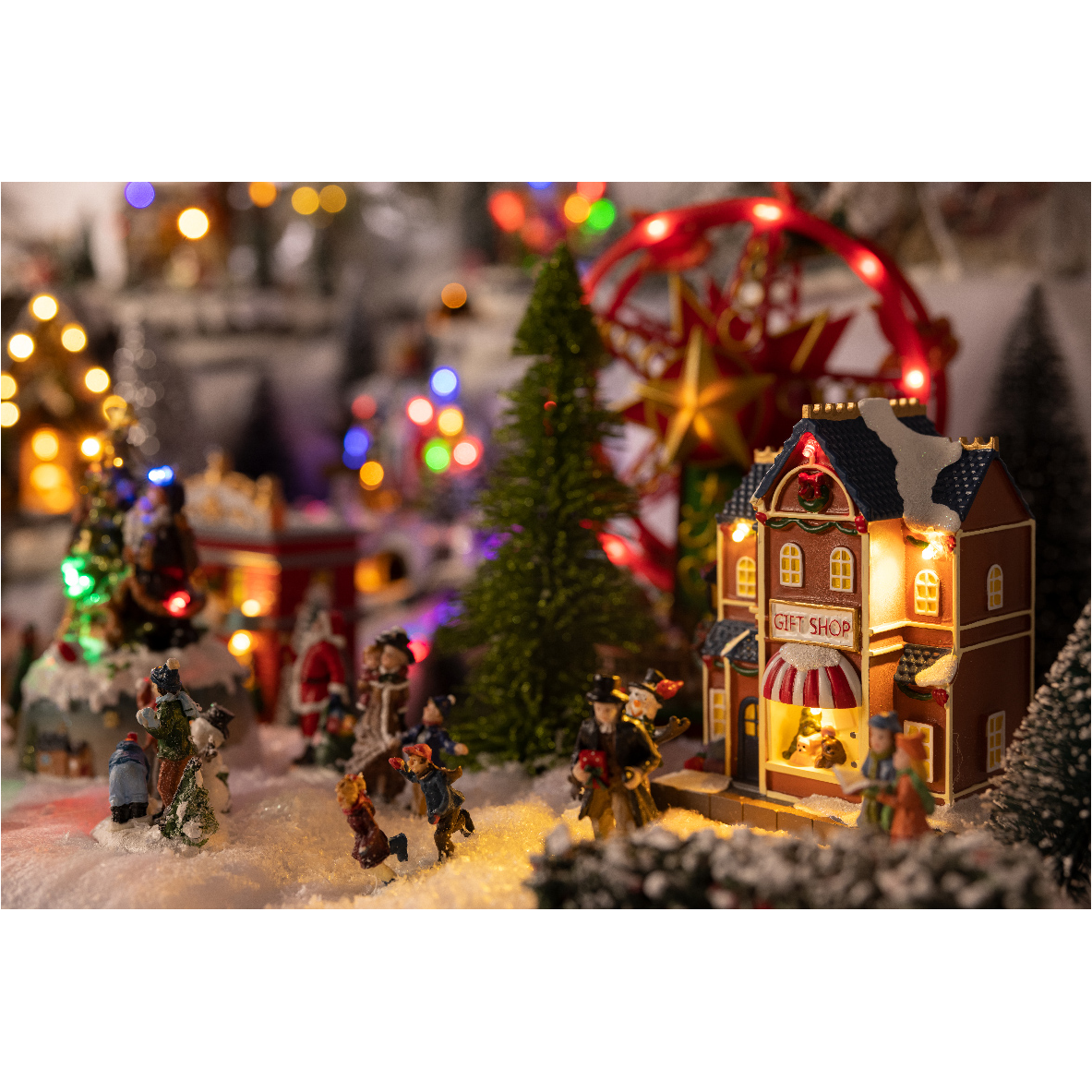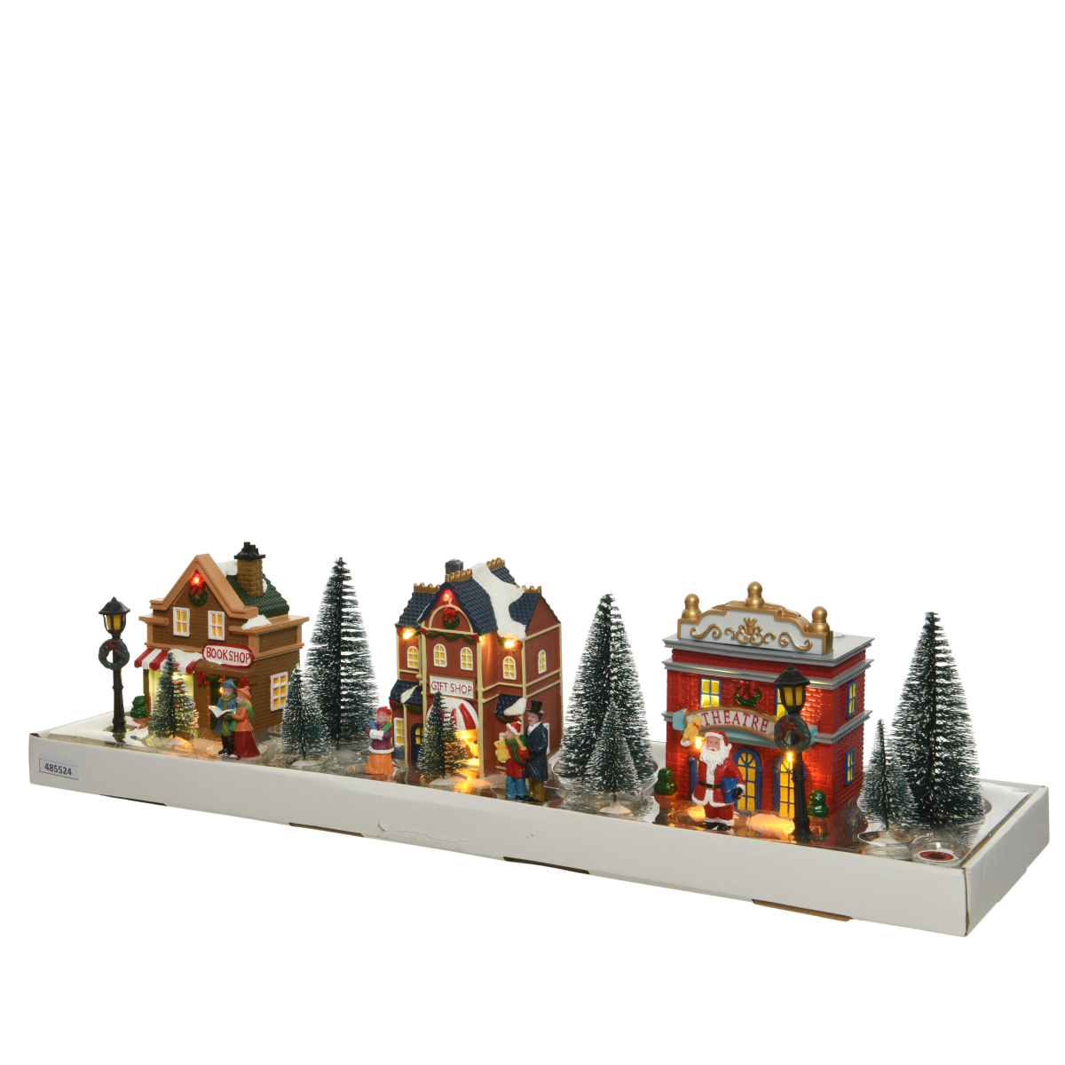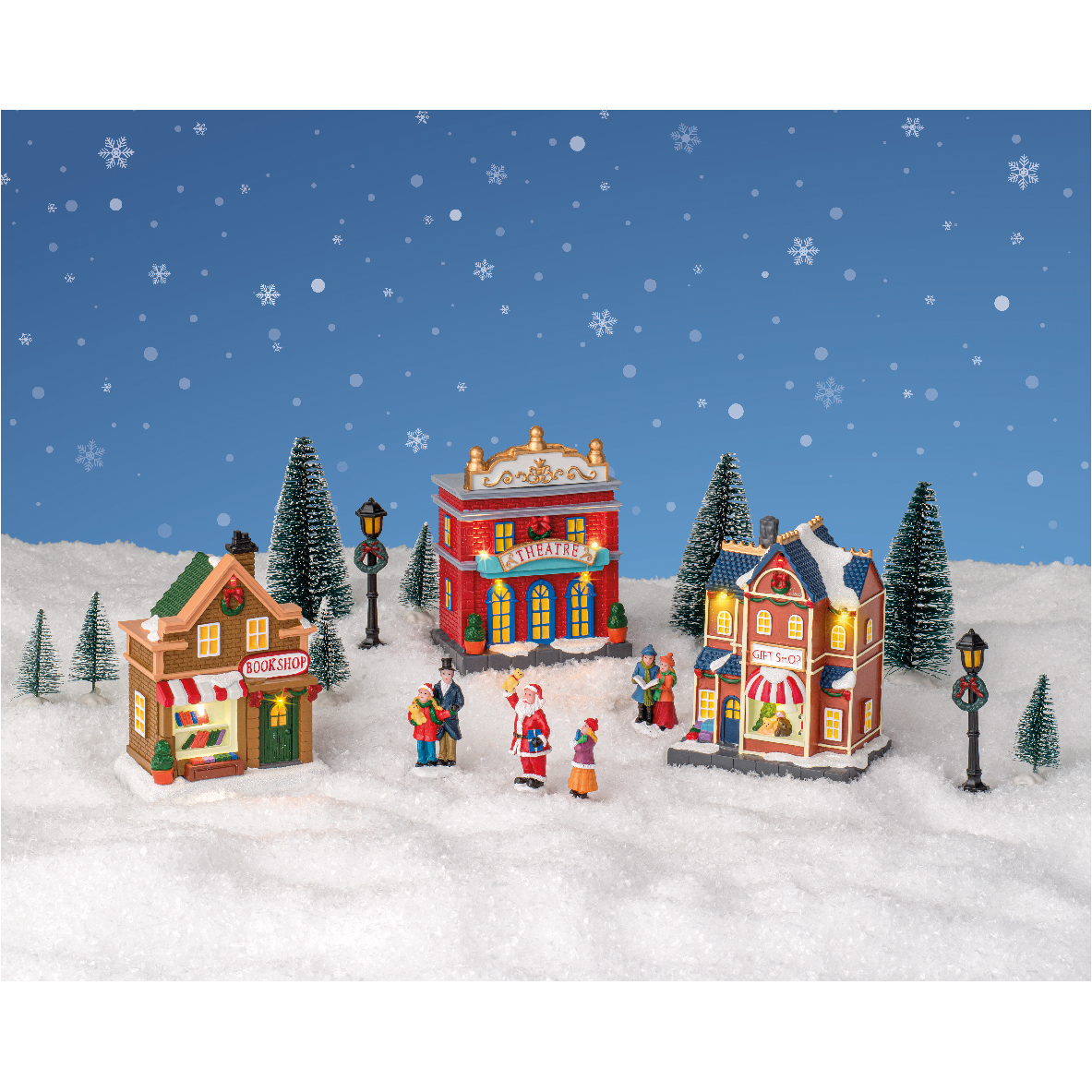 LED-es asztali dekoráció, karácsonyi városrészt idéző tájkép. A szett tartalma: 3 db ház, 3 db nagy fa, 5 db kicsi fa, 2 db lámpa, 4 db figura. Kettő darab AAA elemmel működik, melyeket a szett nem tartalmaz.