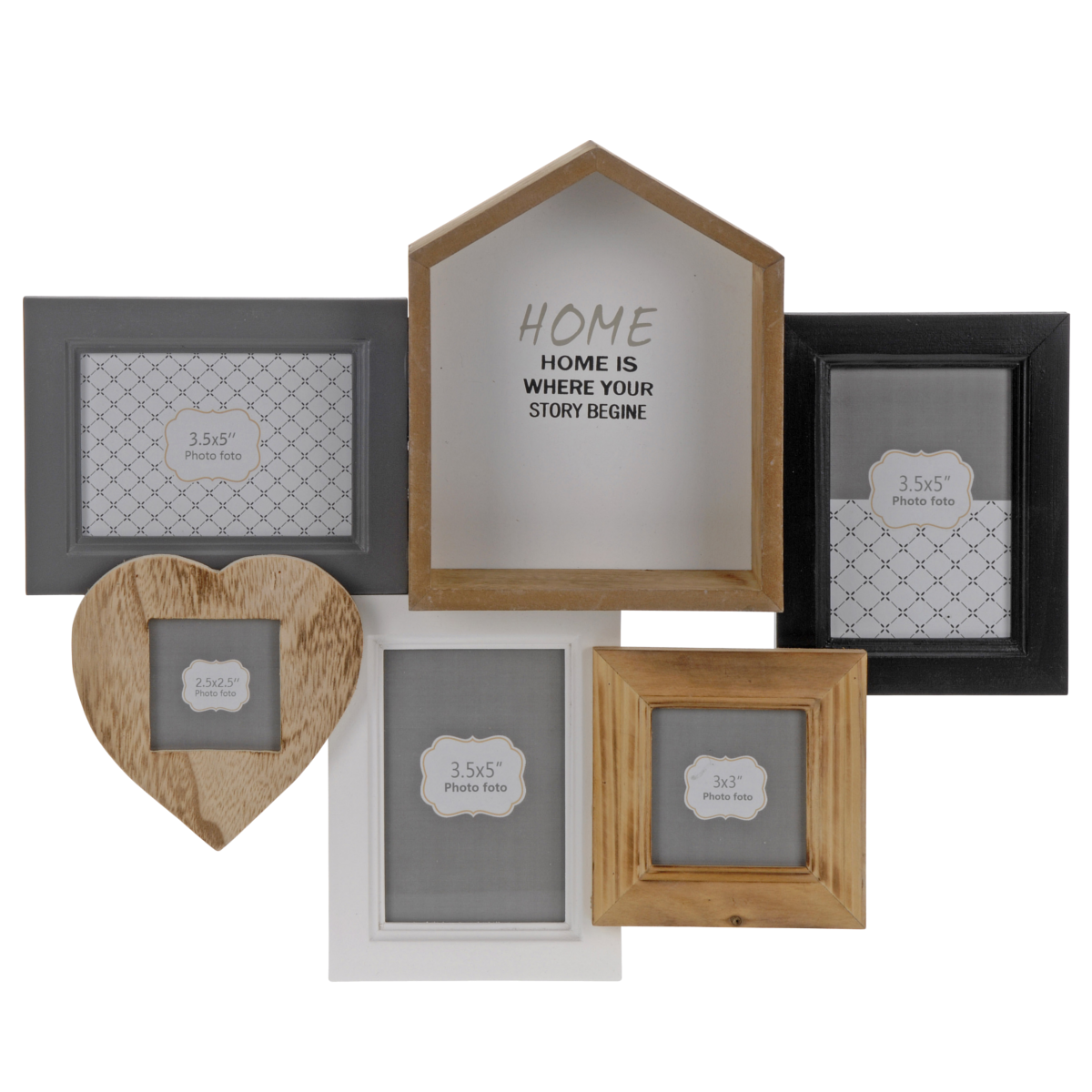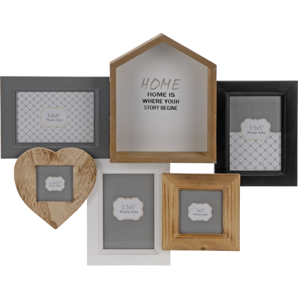 Fotókeret 6 kép számára, anyaga fa, mérete 46x36,5x5 cm, súlya: 760 gramm.