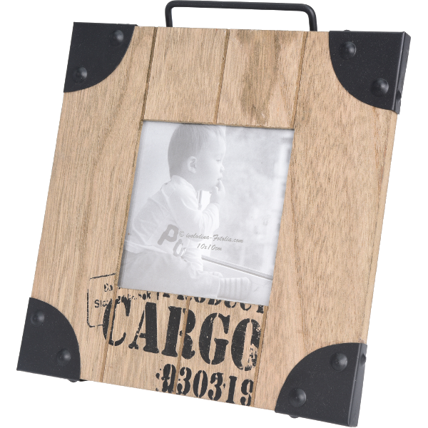 Fa képkeret 10x10 cm fotó számára. Anyaga: fa, fém disszel. Mérete: 190x190x17 mm.