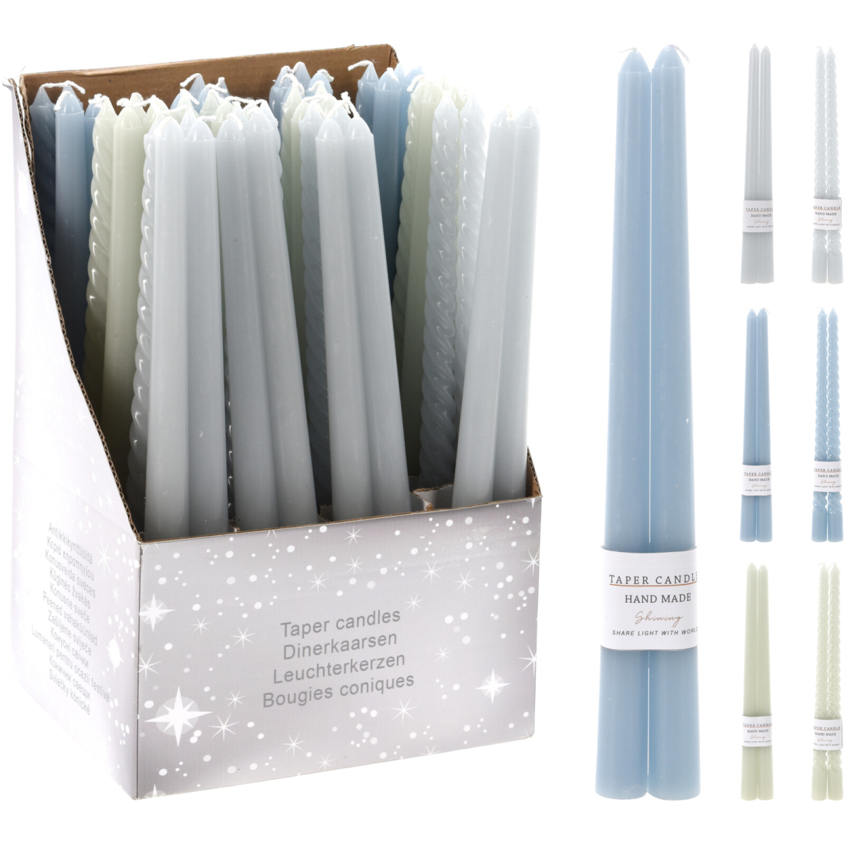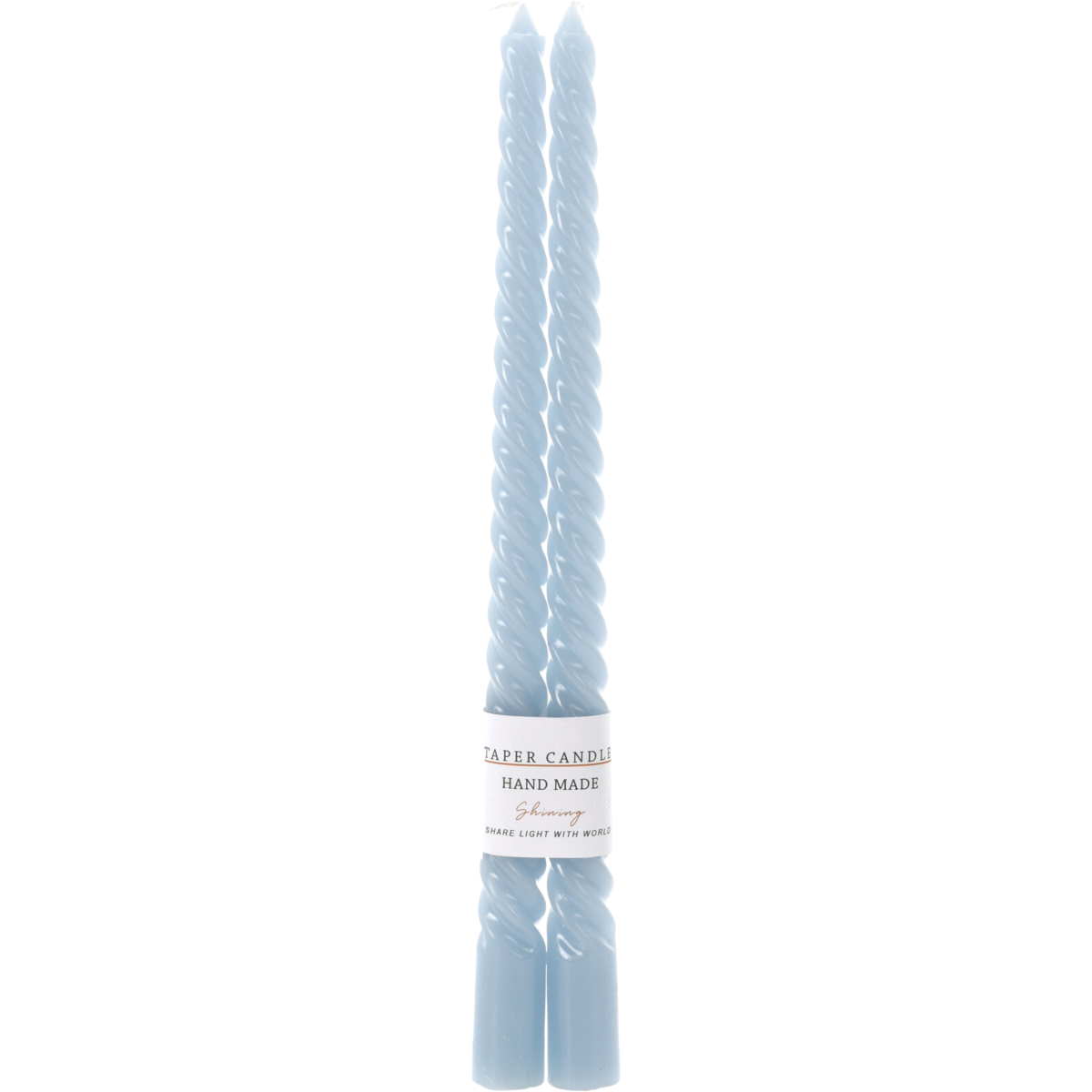 Álló gyertya kettő darabos kiszerelésben, kétféle modell (csavart, egyenes), három színben (zöld, kék, világos kék).