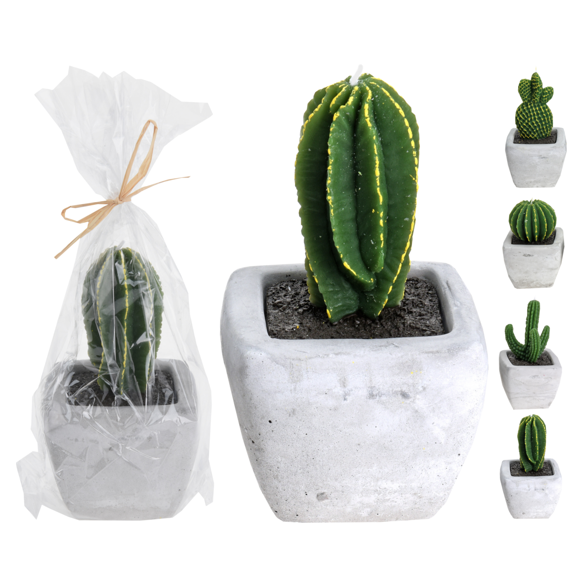 Kaktuszos gyertya cement tartóban. Anyaga: wax és cement , mérete: 5.5x5.5x9 cm, a wax súlya: 35 gram, össztömeg: 125 gram, 4 különböző kaktusz minták.