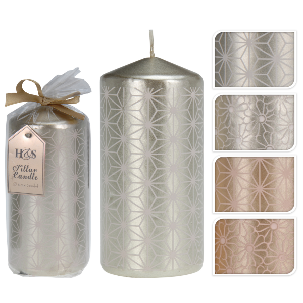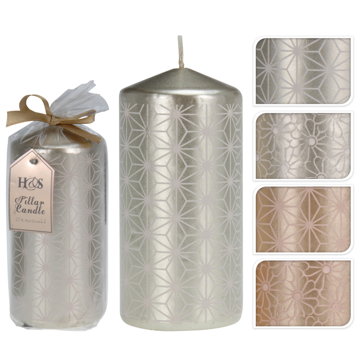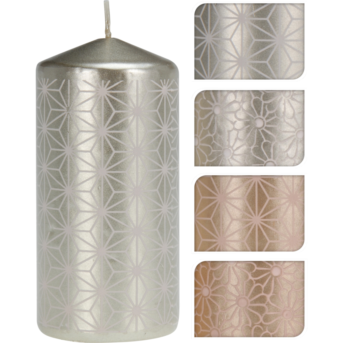 Mintás gyertya. Anyaga: Paraff/Wax. Mérete: 5,5x12 cm. Több féle színben és mintával.