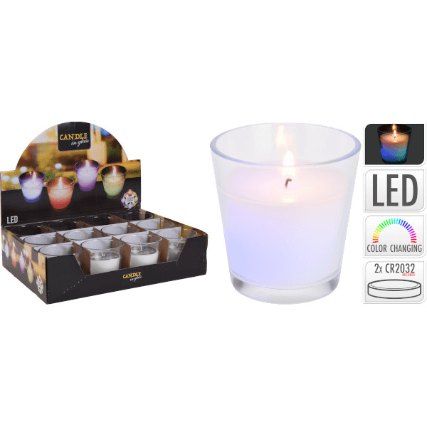 Gyertya üveg pohárban, elemmel működik, 2X CR2032B, mely tartozéka a terméknek.