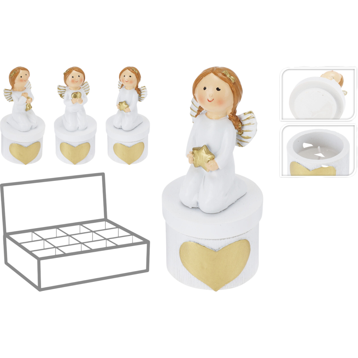 Angyalka formájú gyertyatartó, amely három különböző modellben kapható, méretei 12x5x5 cm. Ezek a gyertyatartók tökéletes kiegészítői lehetnek otthonának vagy ajándékként is szolgálhatnak. Az angyalka formájú design elegáns megjelenést kölcsönöz, míg a kompakt méretek lehetővé teszik, hogy kis helyen is elférjen.