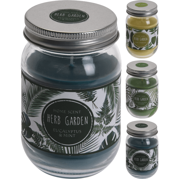 Gyertya üvegben 13cm levél mintás 260g wax, fém tetővel, 3féle