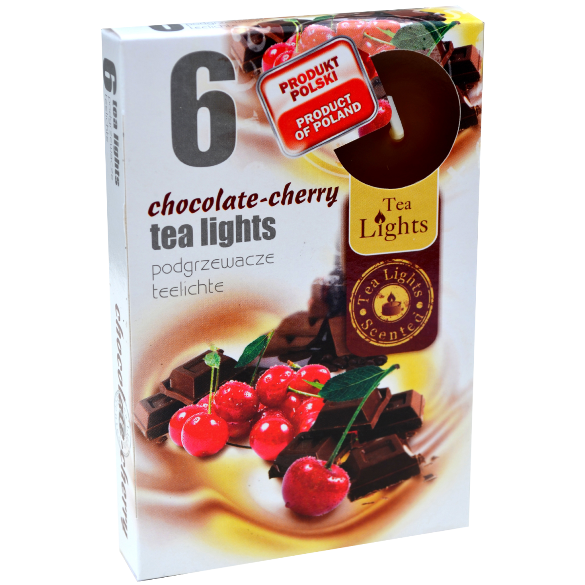 Illatos teamécses 6 db-os csoki-meggy illatban. 1db: magasság: 12 cm, szélesség: 8 cm,égési idő: 4 óra