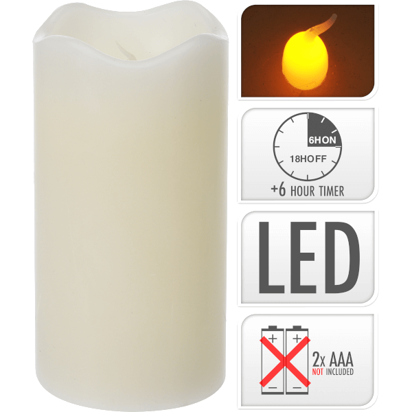 Időkapcsolós, elemes LED-es gyertya, törtfehér színben. Mérete: 7x7x13 cm.