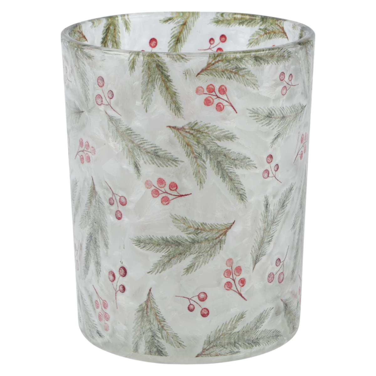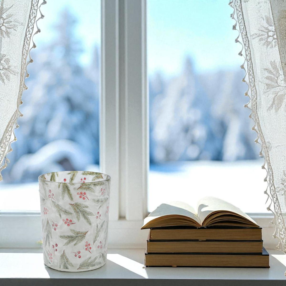 Ez a 10×12,5 cm-es üvegmécsestartó tökéletes választás, ha meleg, ünnepi fényt szeretnél varázsolni otthonodba. A fagyos hatású üvegfelületet zöld fenyőág- és piros bogyóminta díszíti, amely visszafogott, mégis hangulatos megjelenést biztosít.
