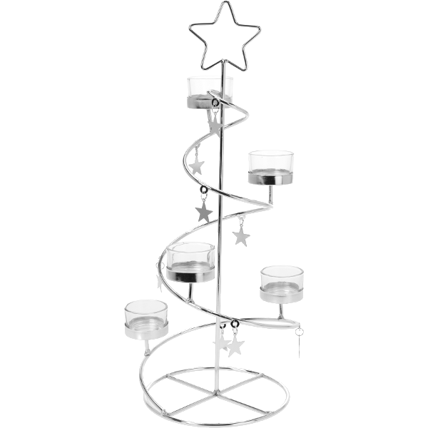 Mécsestartó fémből és üvegből. Mérete : 17x17x45 cm, súly: 736 gramm. Karácsonyfa alakú, 8 kis csillaggal, 5 mécsestartóval, a tetején csillaggal. Ezüst színű.