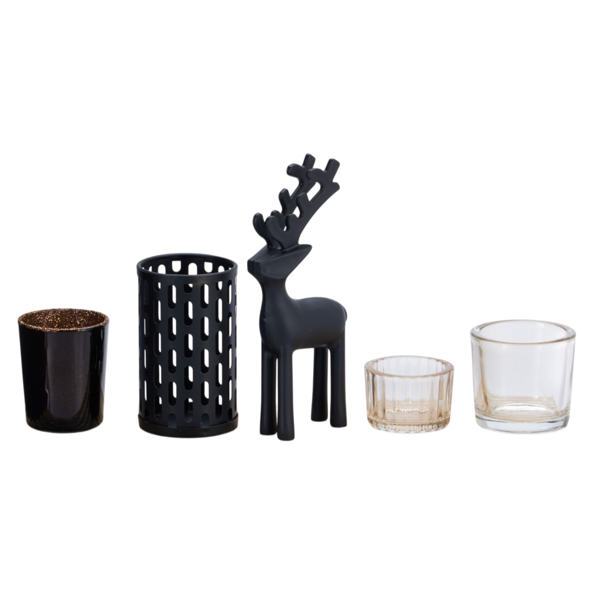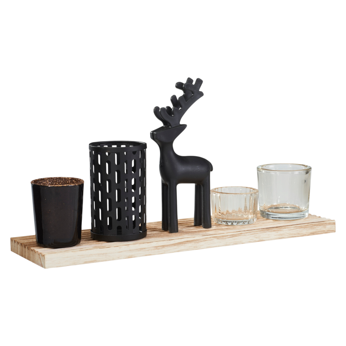 Ez az összetett mécsestartó szett tökéletes választás az ünnepi hangulat megteremtéséhez. A készlet különböző anyagok – üveg, fém, nyírfa és műgyanta – kombinációjával készül, így egyszerre modern és természetes megjelenésű. A 39×10,5×22,5 cm-es elrendezés jól mutat étkezőasztalon, komódon vagy polcon is, és akár egész szezonban látványos dekorációja lehet otthonodnak.