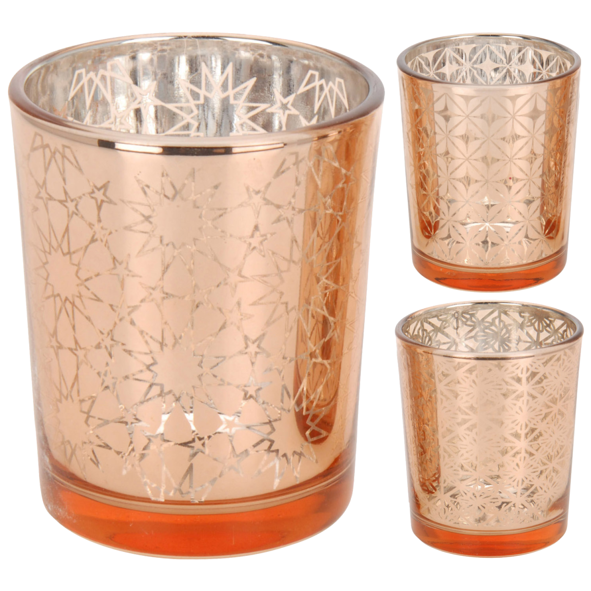 Mécsestartó pohár 3 különböző változatban. Dekoratív réz színű üveg, amely hangulatos világítást ad gyertya égetésekor.