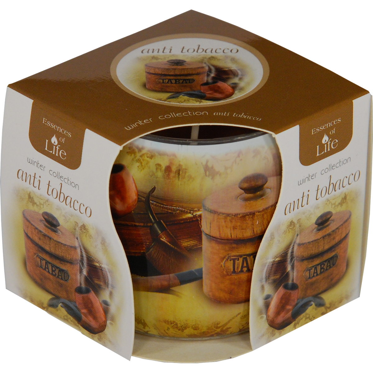 Anti-tobaccoo (dohányfüst elleni) illatgyertya üvegpohárban. Égési idő: 23 óra.