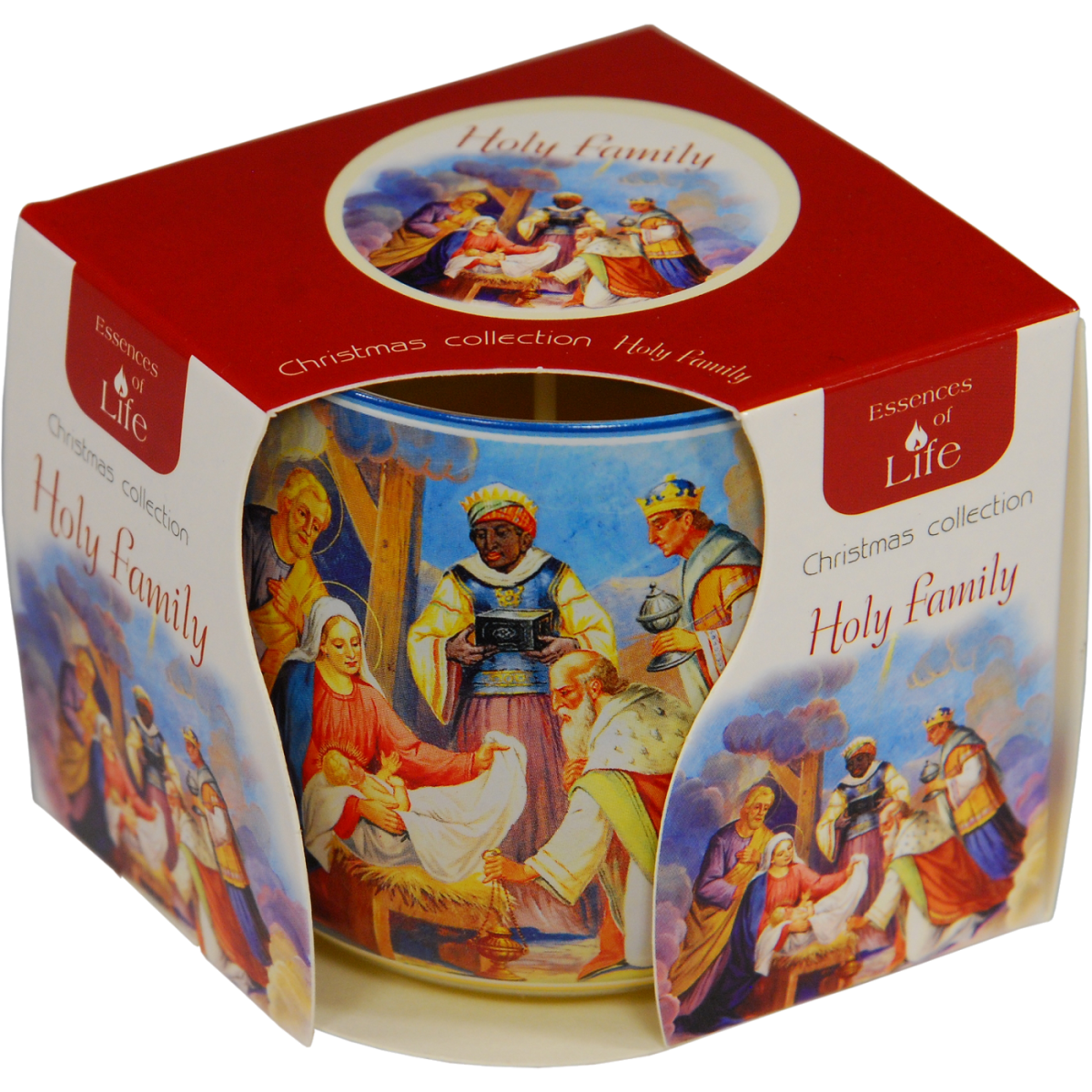 Szent család illatgyertya üvegpohárban. Magasság: 8 cm, szélesség: 8 cm ,égési idő: 23 óra