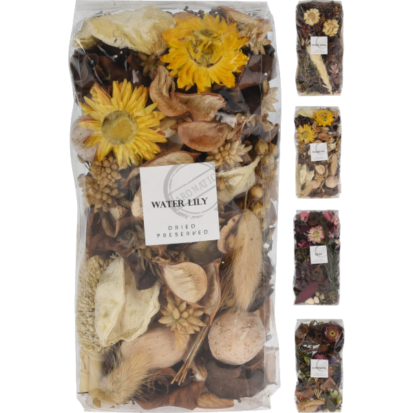 95g illatosító (potpourri) tasakban, mely 4-féle illatban (tündérrózsa, levendula, orgona, pézsma) elérhető. Online rendelés esetén kérjük, szíveskedjen feltüntetni az igényelt illatot a rendelés véglegesítése előtt a megjegyzés rovatban. Igazán kellemes hangulatot teremthetünk otthonunkban ezzel az illatosítóval.