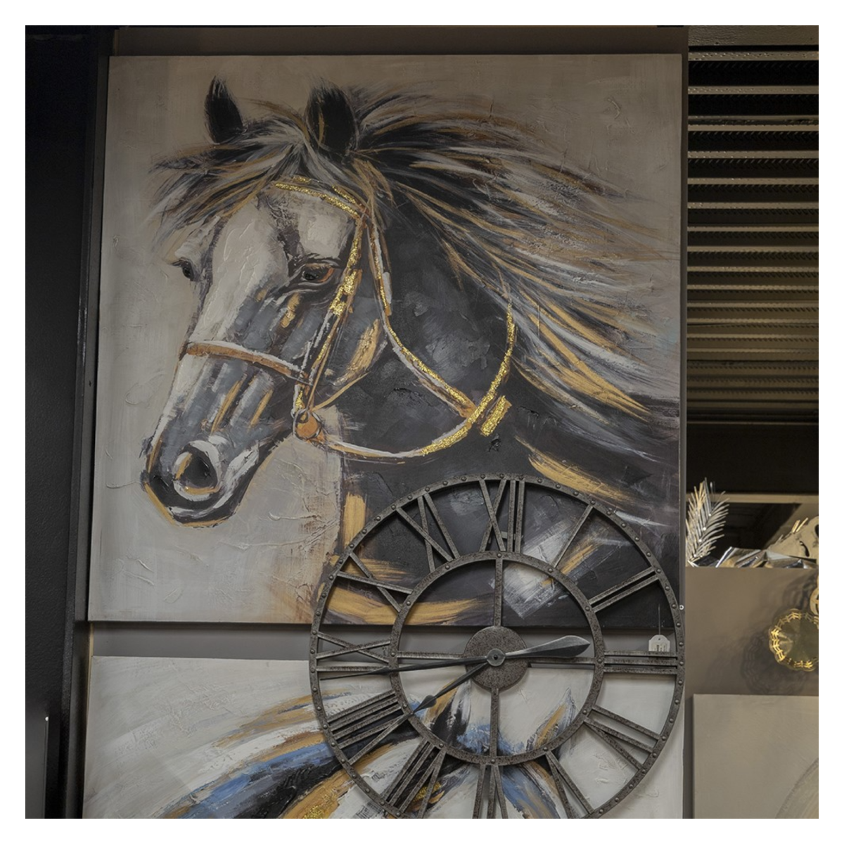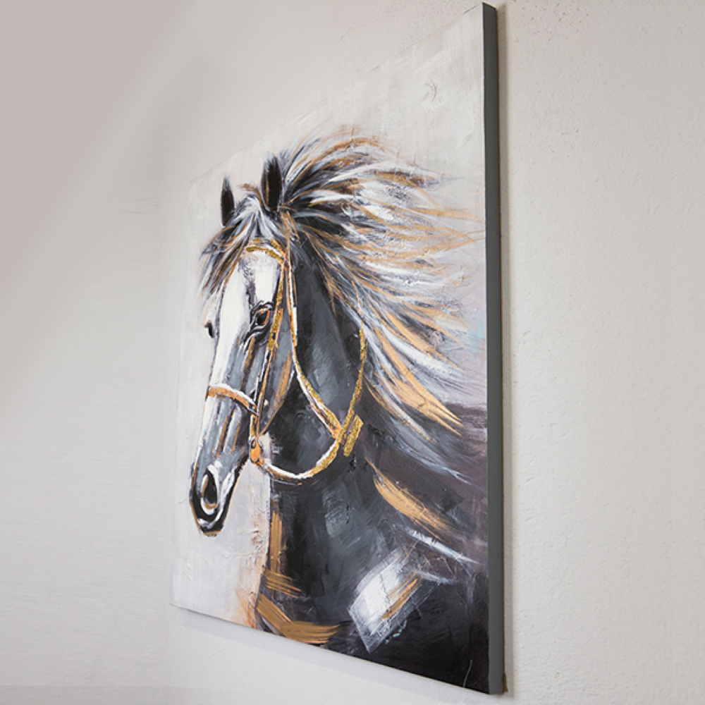 A 100 cm x 100 cm-es vászonkép markáns lófejet ábrázol fekete, fehér és arany tónusokkal.