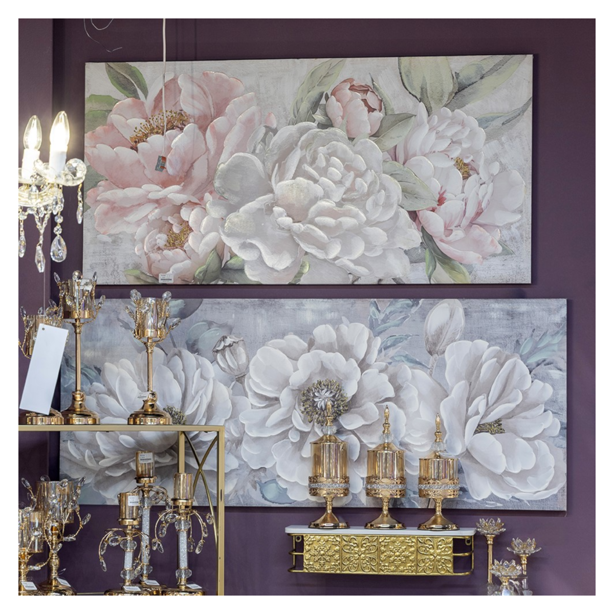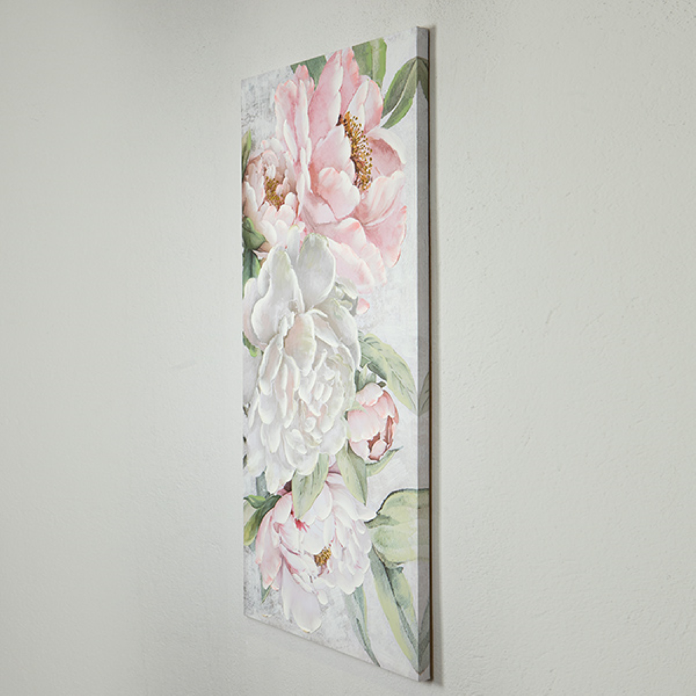 Ez a 80 cm x 120 cm-es vászonkép lágy rózsaszín és fehér virágmotívumaival kifinomult stílust kölcsönöz bármely helyiségnek.