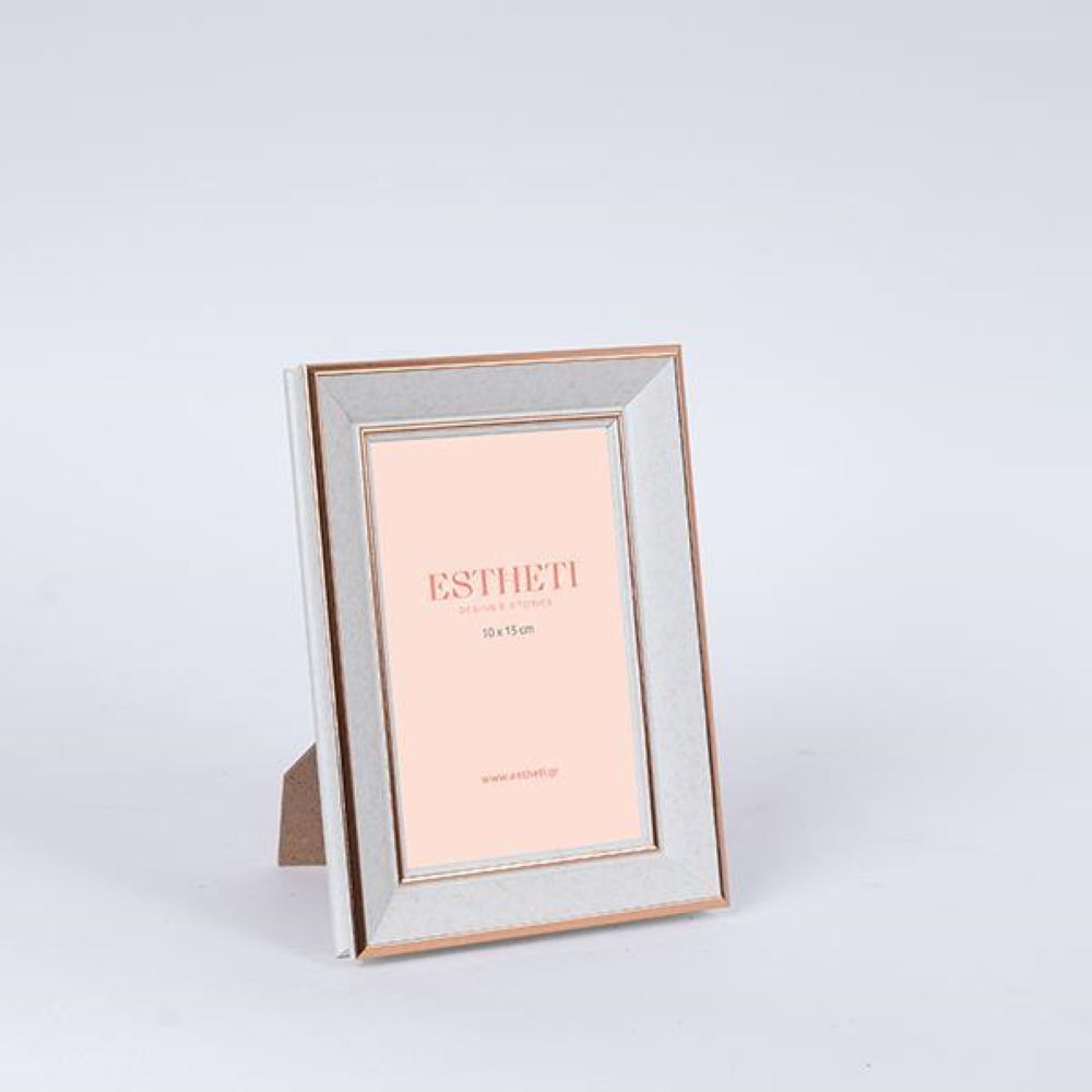 Fehér színű, arany szegélyekkel díszített műanyag képkeret, amely letisztult, elegáns megjelenésével jól illeszkedik a legtöbb lakberendezési stílushoz. Kompakt méretének köszönhetően könnyen elhelyezhető asztalon, polcon vagy párkányon, ahol ízlésesen emeli ki a benne elhelyezett 10x15cm-es fényképet. Könnyű súlyú kialakítása egyszerű kezelhetőséget biztosít, nem igényel összeszerelést. Egy darab kép elhelyezésére alkalmas.