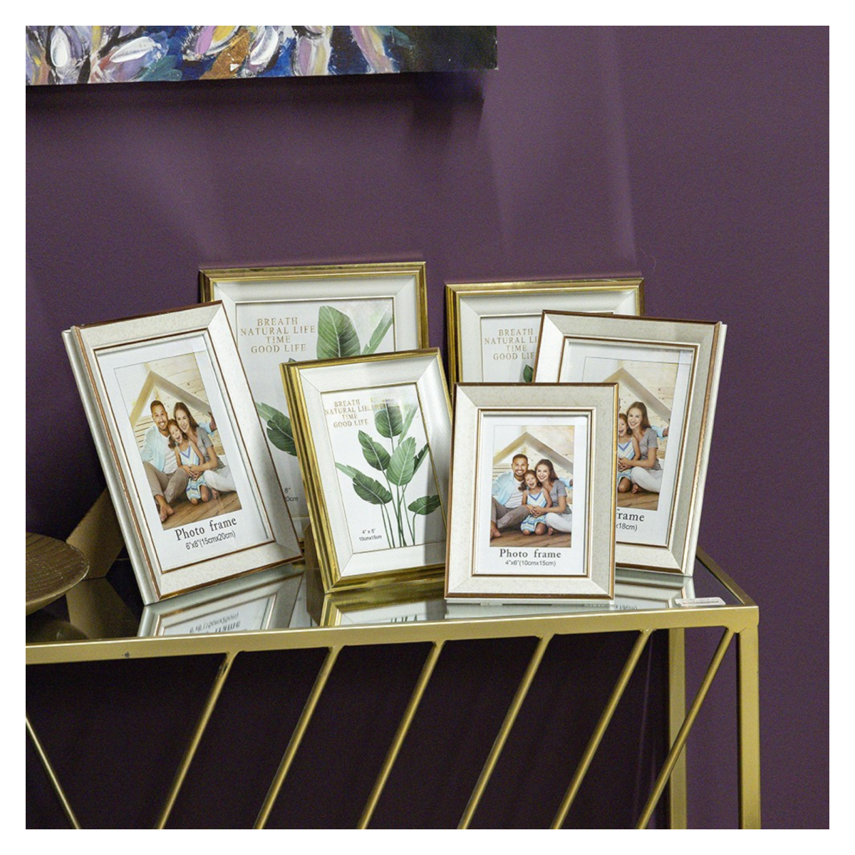Fehér színű, arany szegélyekkel díszített műanyag képkeret, amely letisztult, elegáns megjelenésével jól illeszkedik a legtöbb lakberendezési stílushoz. Kompakt méretének köszönhetően könnyen elhelyezhető asztalon, polcon vagy párkányon, ahol ízlésesen emeli ki a benne elhelyezett 13x18cm-es fényképet. Könnyű súlyú kialakítása egyszerű kezelhetőséget biztosít, nem igényel összeszerelést. Egy darab kép elhelyezésére alkalmas.