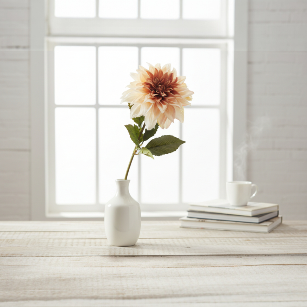 A 73 cm magas mű dália dekoratív, nagy virágfejével és részletgazdag szirmaival természetes hatást kölcsönöz bármely térnek.