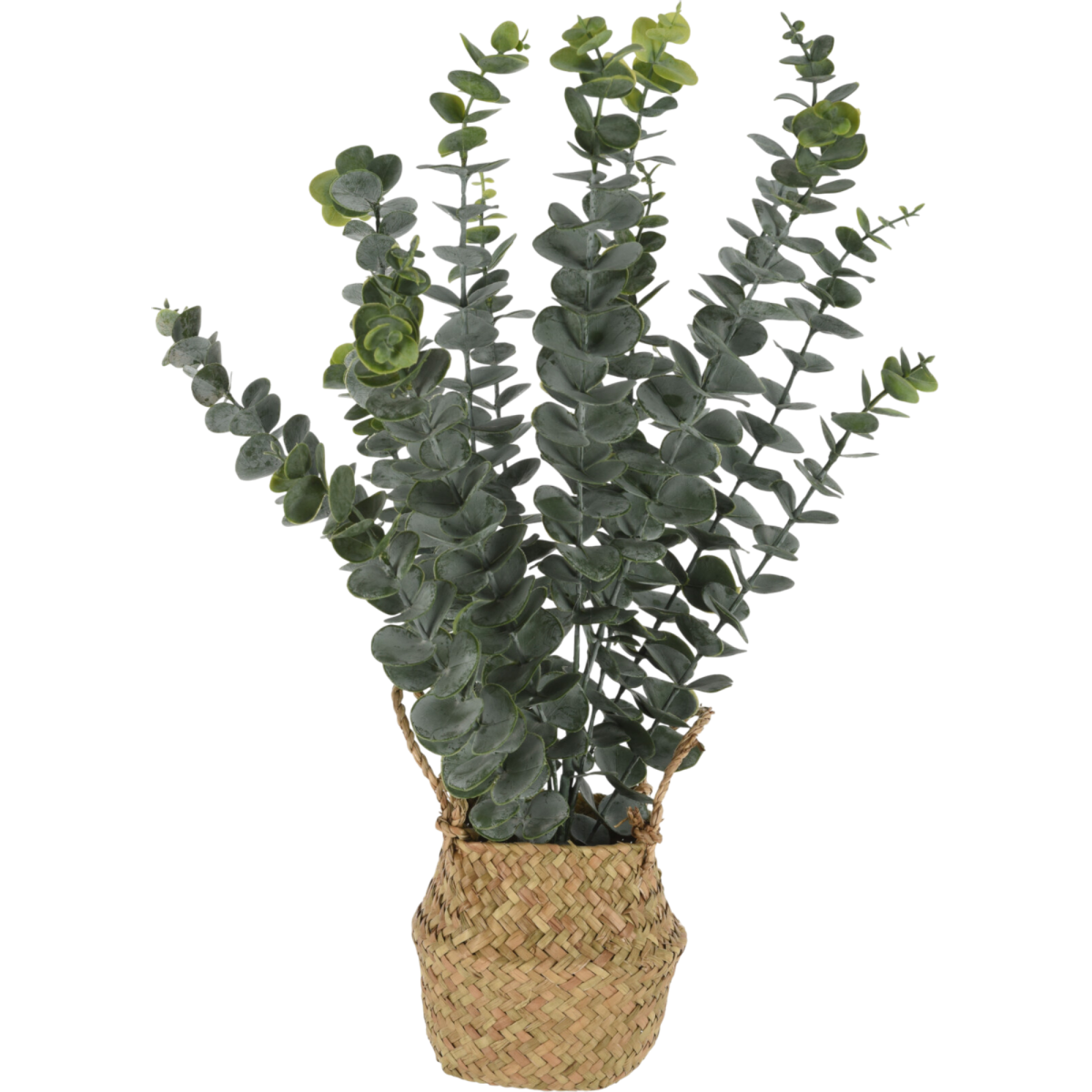 Ez a mű eukaliptusz kosárban ideális választás, ha természetes hatású, gondozásmentes zöld dekorációt keresel.
