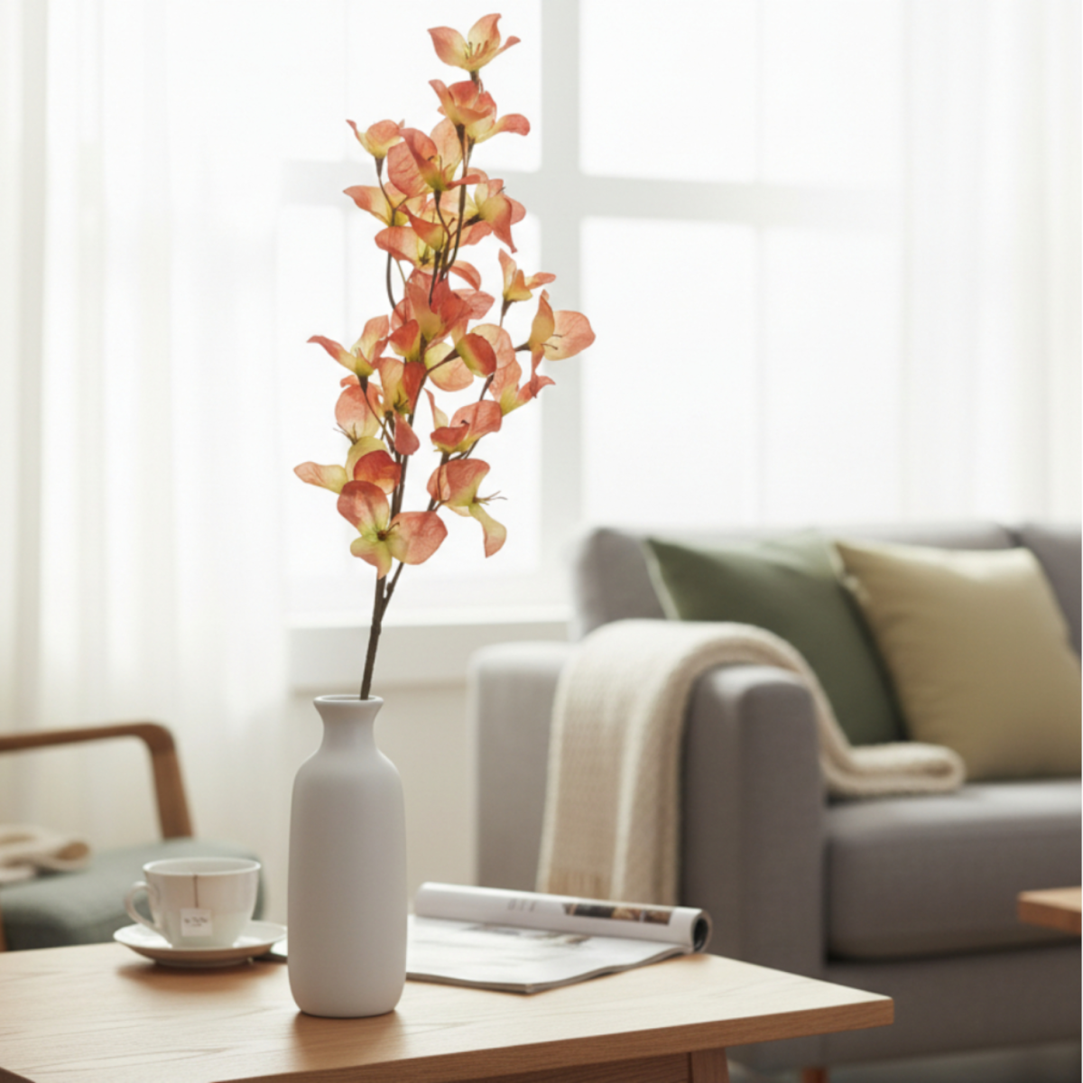 A gazdagon elágazó szárak és a lágy szirmú virágok látványos és friss megjelenést biztosítanak, miközben a növény teljesen gondozásmentes. Öt különböző színváltozatból választhatsz, így egyszerűen megtalálhatod a tér hangulatához illő árnyalatot. Poliészter és polietilén anyagának köszönhetően tartós, formáját jól megőrző dekoráció.