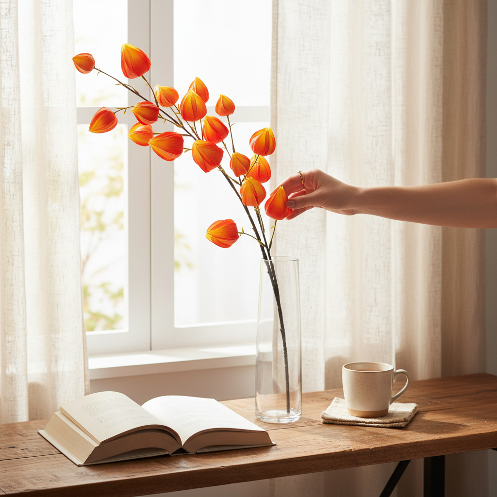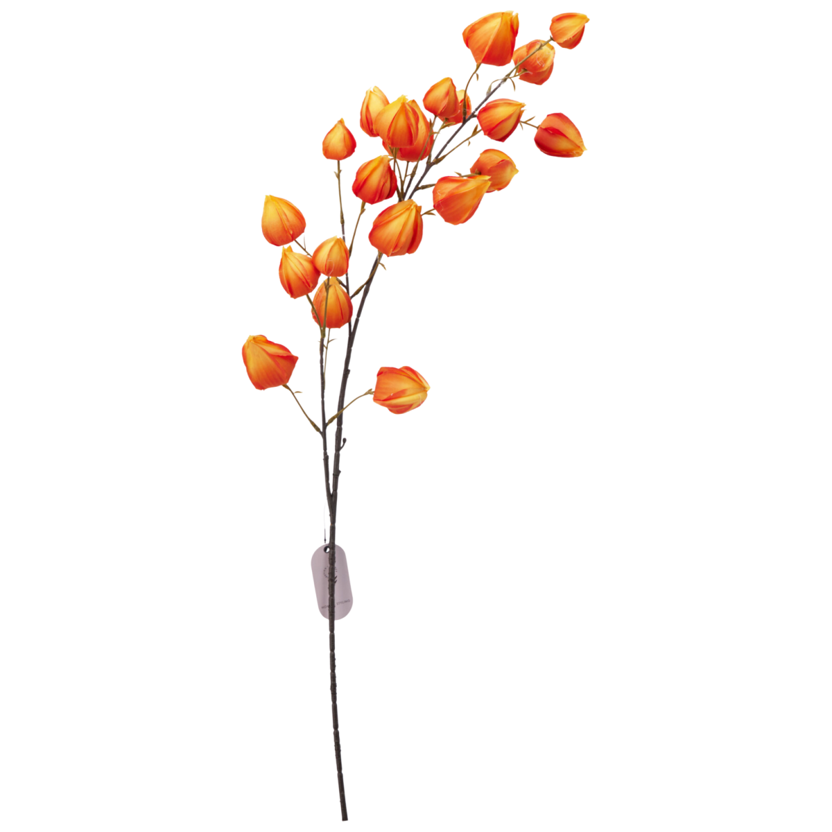 A jellegzetes, lámpásszerű termések élénk színeikkel azonnal magukra vonják a figyelmet, miközben a növény teljesen gondozásmentes. A hosszú, jól formázható szár lehetővé teszi önálló díszként vagy nagyobb kompozíciók részeként való használatát. Poliészter és polietilén anyagból készült, így tartós, formatartó dekoráció.