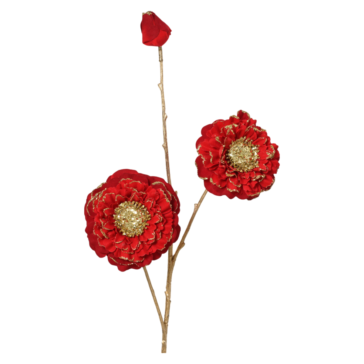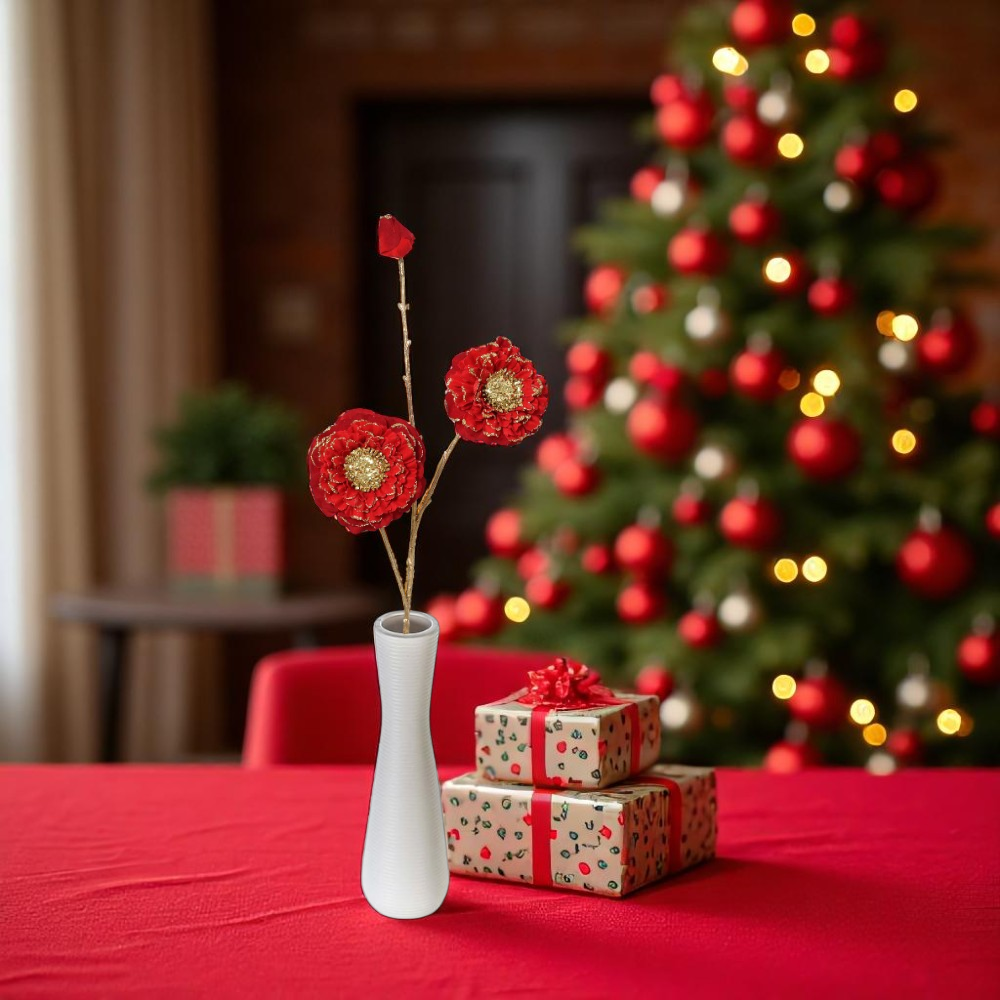 Ez a piros művirág elegáns, háromfejes kialakításával és csillogó arany közepével tökéletes kiegészítője lehet karácsonyi vagy ünnepi dekorációdnak. A részletgazdag sziromkialakítás és a finoman csillogó kontúrvonalak különleges fényt adnak a kompozíciónak.