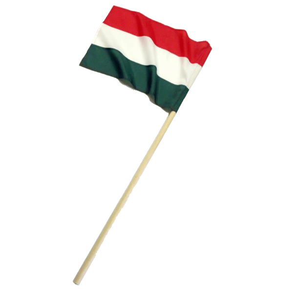 Zászló anyaga: 100 % poliészter, rúd anyaga: fa.