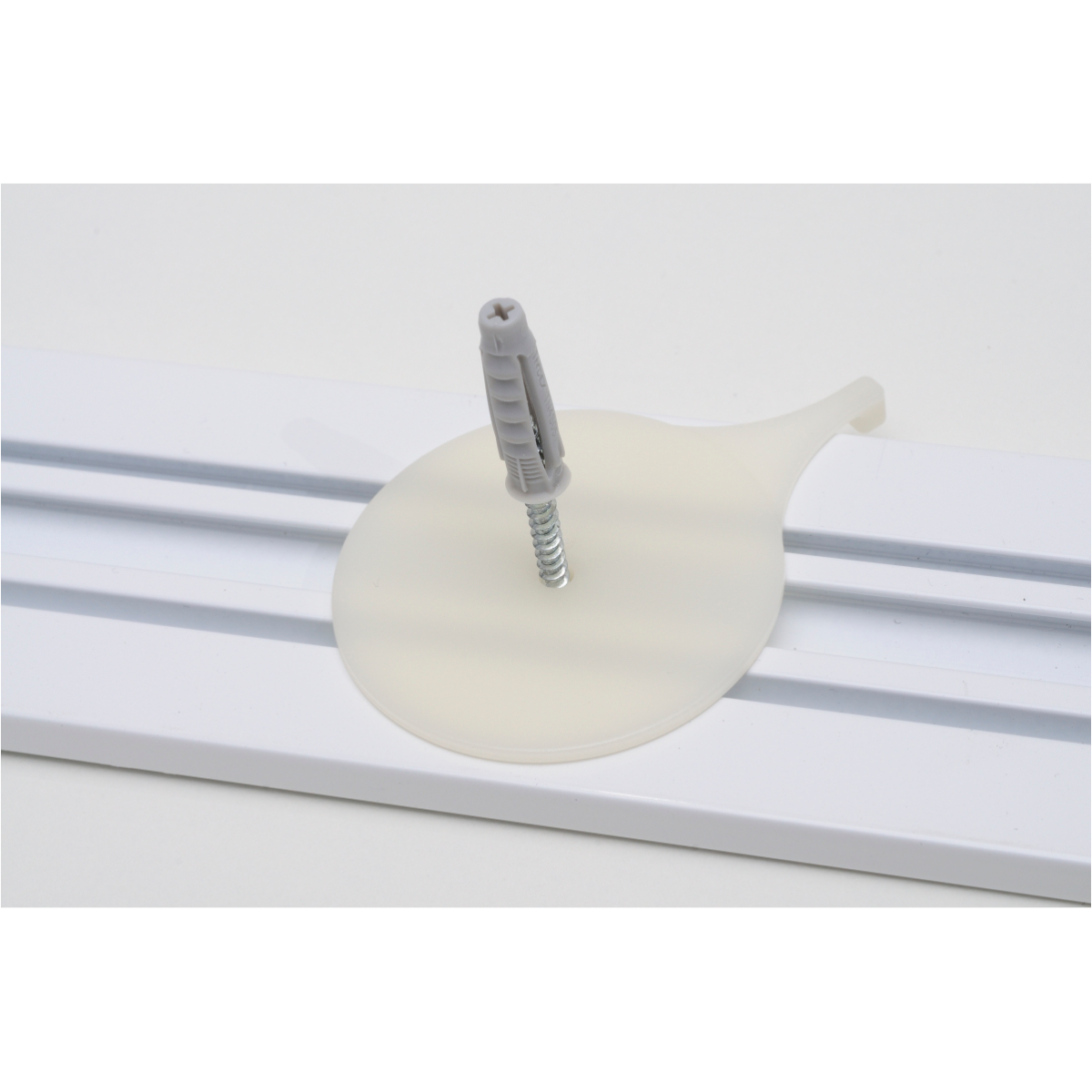 Slim Line függönysínhez mennyezeti rögzítő tartókonzol / rögzítő tárcsa. A rögzítő tárcsa segítségével a függönysín átfúrás nélkül rögzíthető. A szett tartalma: 2 darab mennyezeti tárcsa, 2 darab rögzítő csavar és 2 darab dübel.