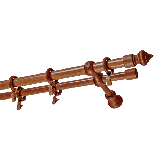 Agat karnis szett fa 280cm, átmérője: 25mm, 2-soros fa garnitúra, kompletten végzárókkal, tartókonzolokkal, rögzítő elemekkel, karikákkal ráncszedő akasztókkal, cseresznye színben értékesítjük.