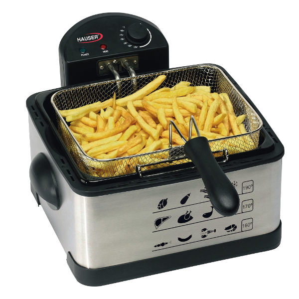 Hauser olajsütő DFS-430 -2 kisebb és 1 nagyobb sütékosár -űrtartalom: 4liter -hidegzónás technológia -rozsdamentes acél tartály fűtőszál és tető -szabályozható hőfok: 190 °C-ig -betekintő ablak -működésjelző lámpa -2000 W teljesítmény