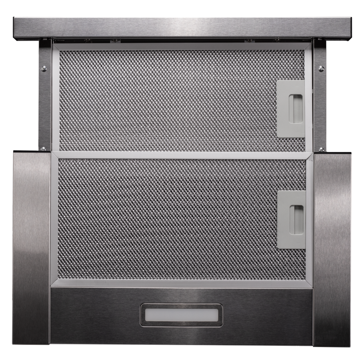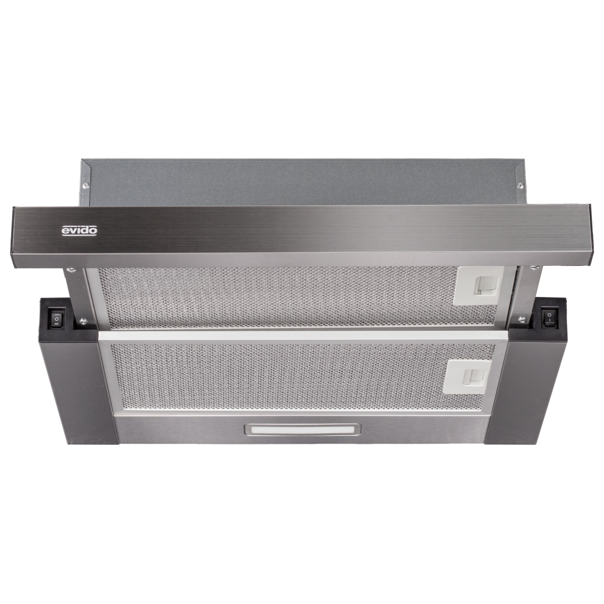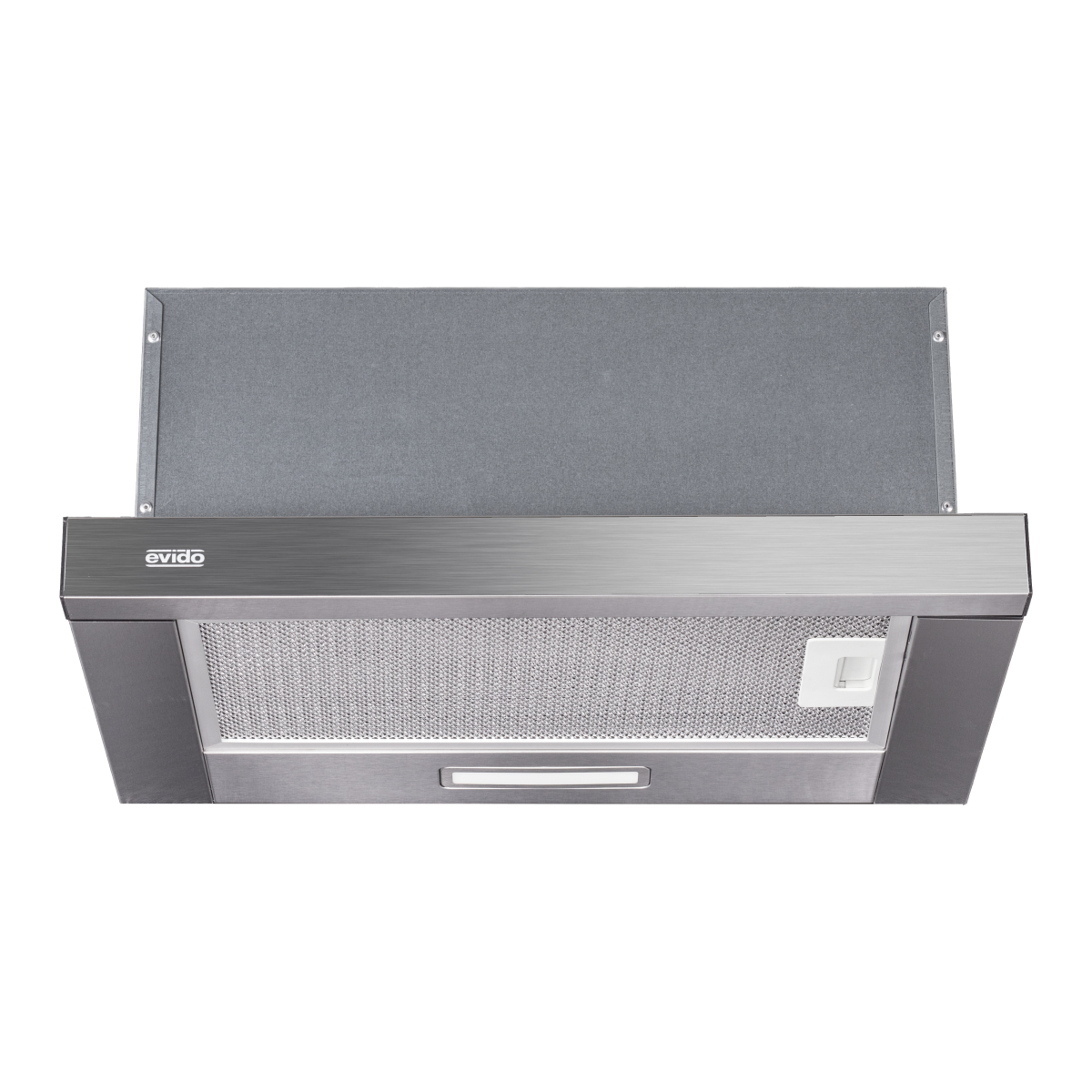 Beépíthető, teleszkópos kihúzható páraelszívó, 50 cm szélességgel, inox fronttal, felső kivezetéssel. Vezérlés: 2 fokozatú billenőkapcsoló. Csőcsonk mérete: Ø 150mm. Alumínium zsírszűrővel.