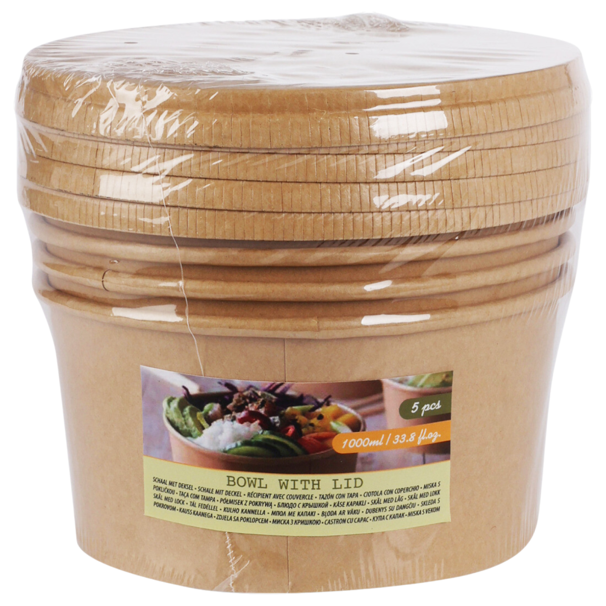 Ez az 5 darabos, fedeles tároló szett praktikus és sokoldalú megoldást kínál ételek tárolásához és szállításához. A kraft eljárással készült papír külső és a belső polietilén bevonat együttese biztosítja a stabilitást és a nedvességgel szembeni ellenállást, miközben a fedél segít megőrizni a frissességet.