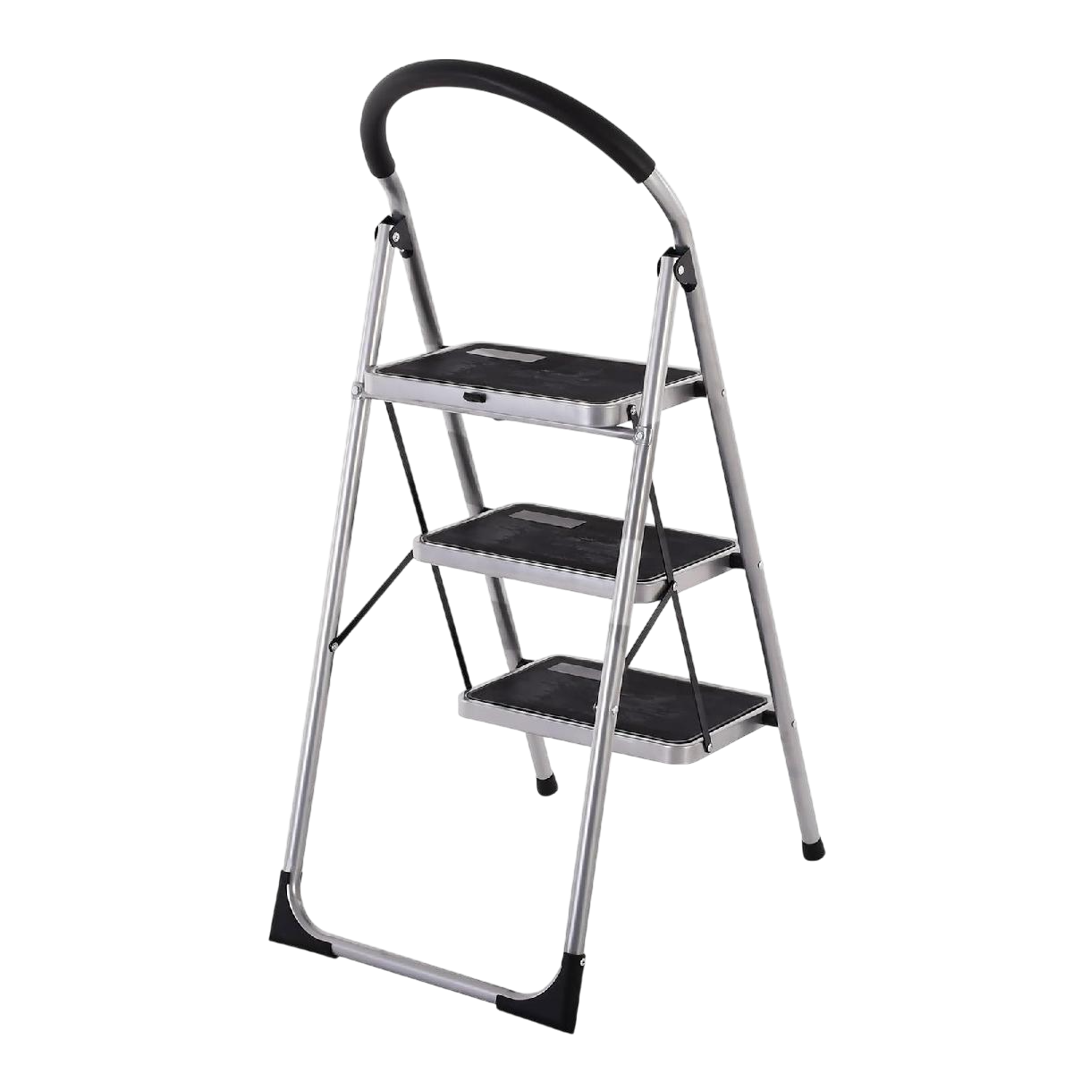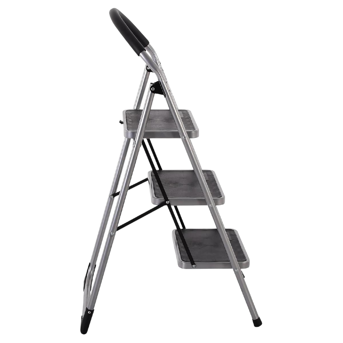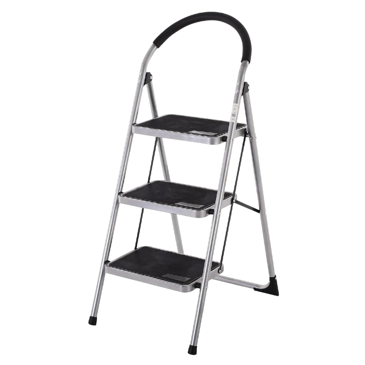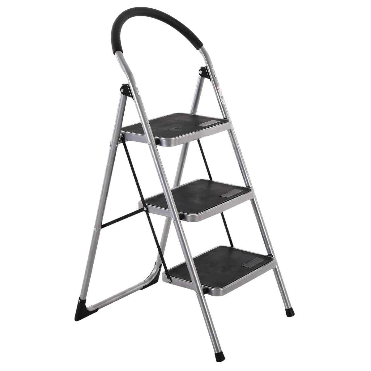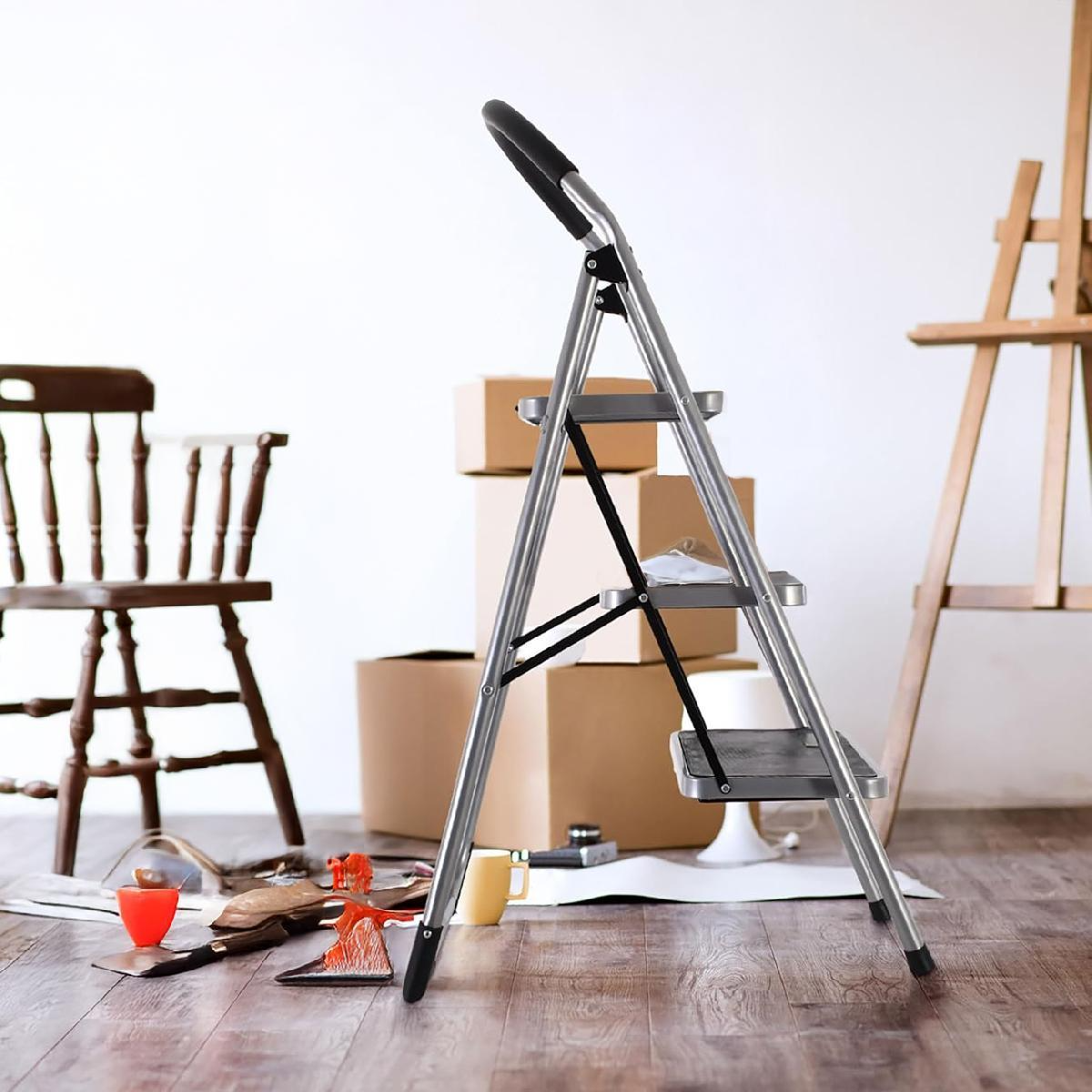 Acélból készült 3 fokos háztartási létra, amelynek 150 kg a maximális terhelhetősége. Nyitott állapotban a létra magassága 106 cm, a legfelső létrafok magassága 72 cm. A létrafokok távolsága 25 cm, a fellépő mérete 38 x 26 cm.