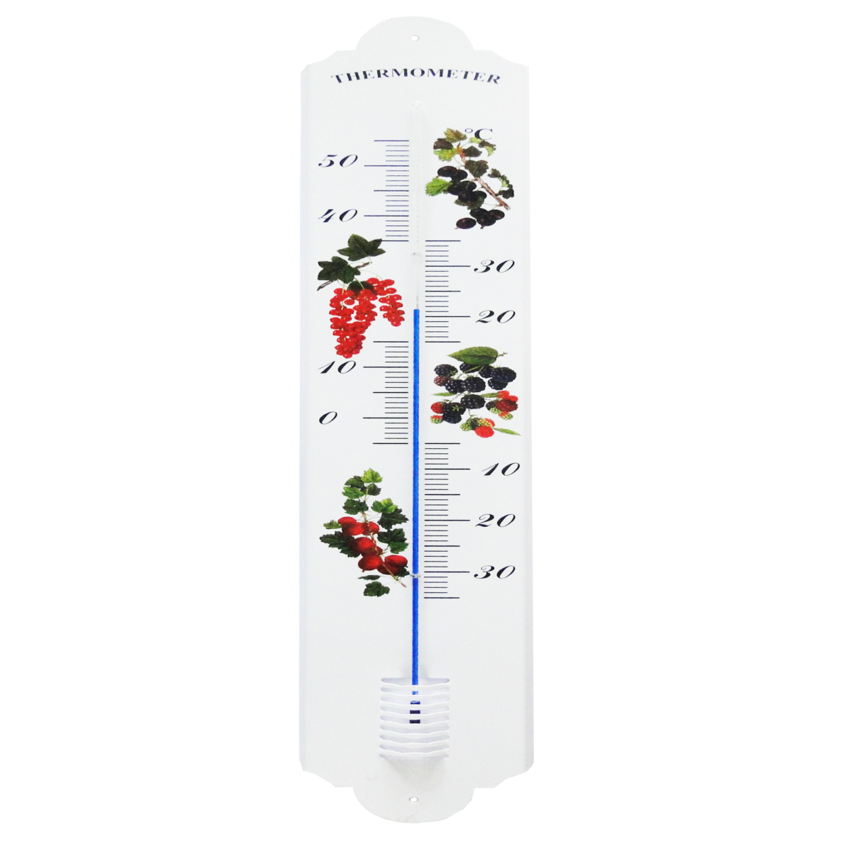 Kerti hőmérő fém, gyümölcsös, 2-alkohol szál. Mérési intervallum: -30°C-tól +50°C -ig. Mérete: 70cm.