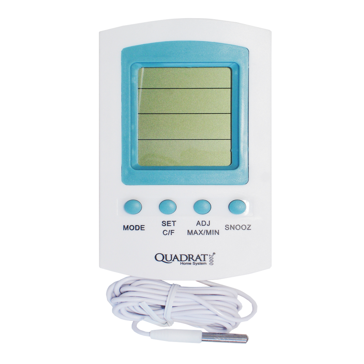 Hőmérő digitális, fehér, külső hő mérésre. Mérete: 14cm. Külső-belső digitális hő és páratartalom mérő. 4 soros kijelző, időjárásfüggő ikonok, dátum kijelzés. Ébresztő és csengő funkció, szundi funkció ( 4 ismétlés). Mérési intervalum: belső: -10°C és +60°C között vagy 14F és 140F között. Külső: -50°C és +70°C között vagy -58F és 158F között. Hőmérséklet és páratartalom mérés, páratartalom mérési intervallum: 20% és 90% között. Pontosság: +/-1°C vagy +/-2F, +/-5%RH, beosztás: 0.1°C vagy 0.1 F, 1%RH. Max/Min hőmérséklet és páratartalom memória, 1,5 V AA elemmel működik.
