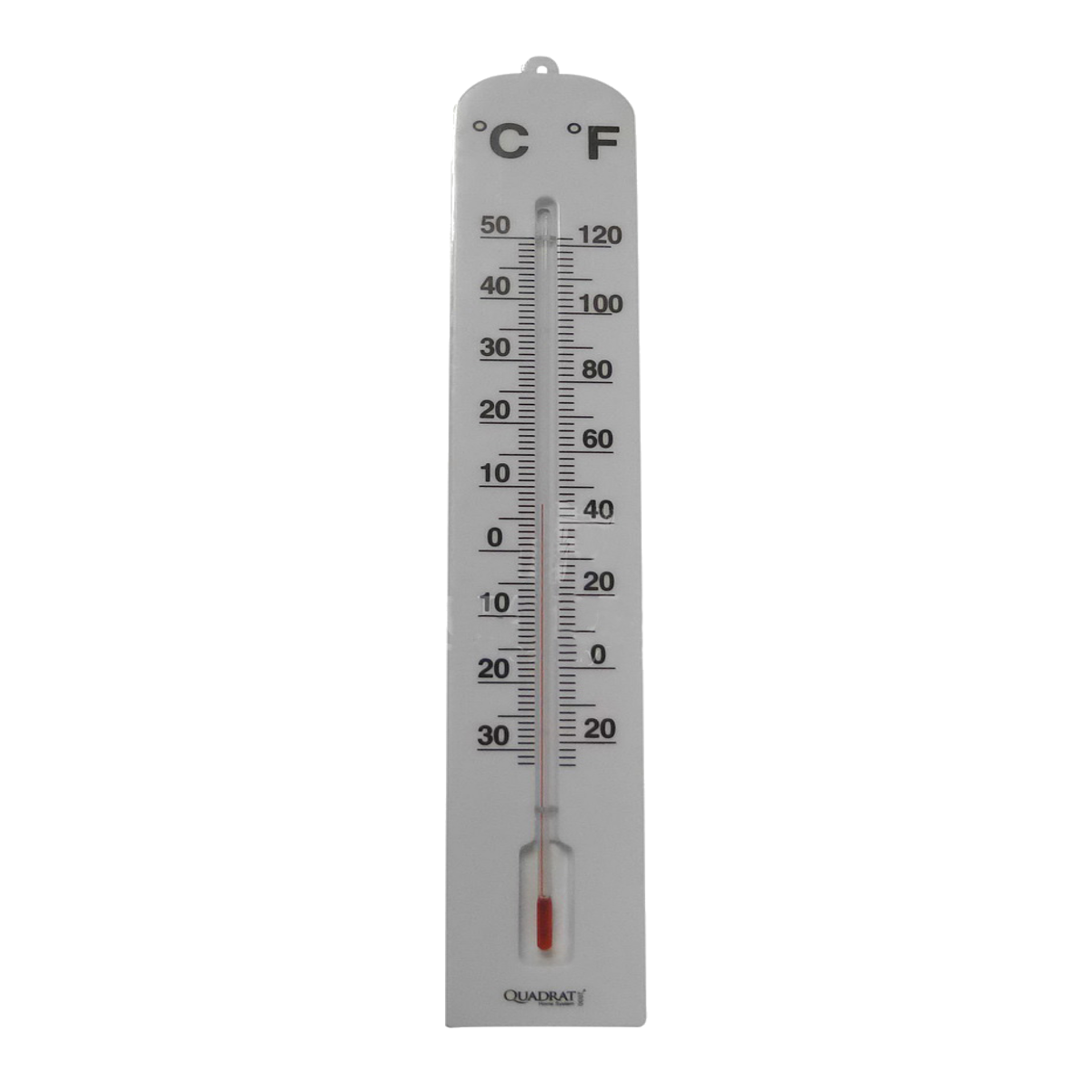 Hőmérő 40cm-es műanyag, 2-alkohol szál, fehér színű. Mérési intervallum: -30°C +50°C, -20°F +120°F.