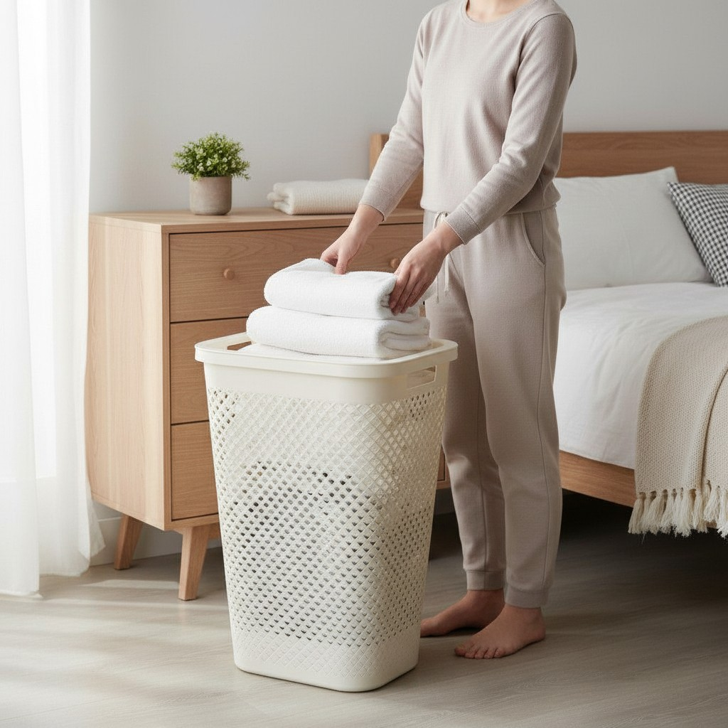 A strapabíróbb műanyag kialakítás ellenáll a mindennapi használat során fellépő igénybevételnek, miközben könnyen tisztán tartható. Méretének köszönhetően elegendő helyet biztosít a szennyes ruhák rendszerezett gyűjtéséhez.