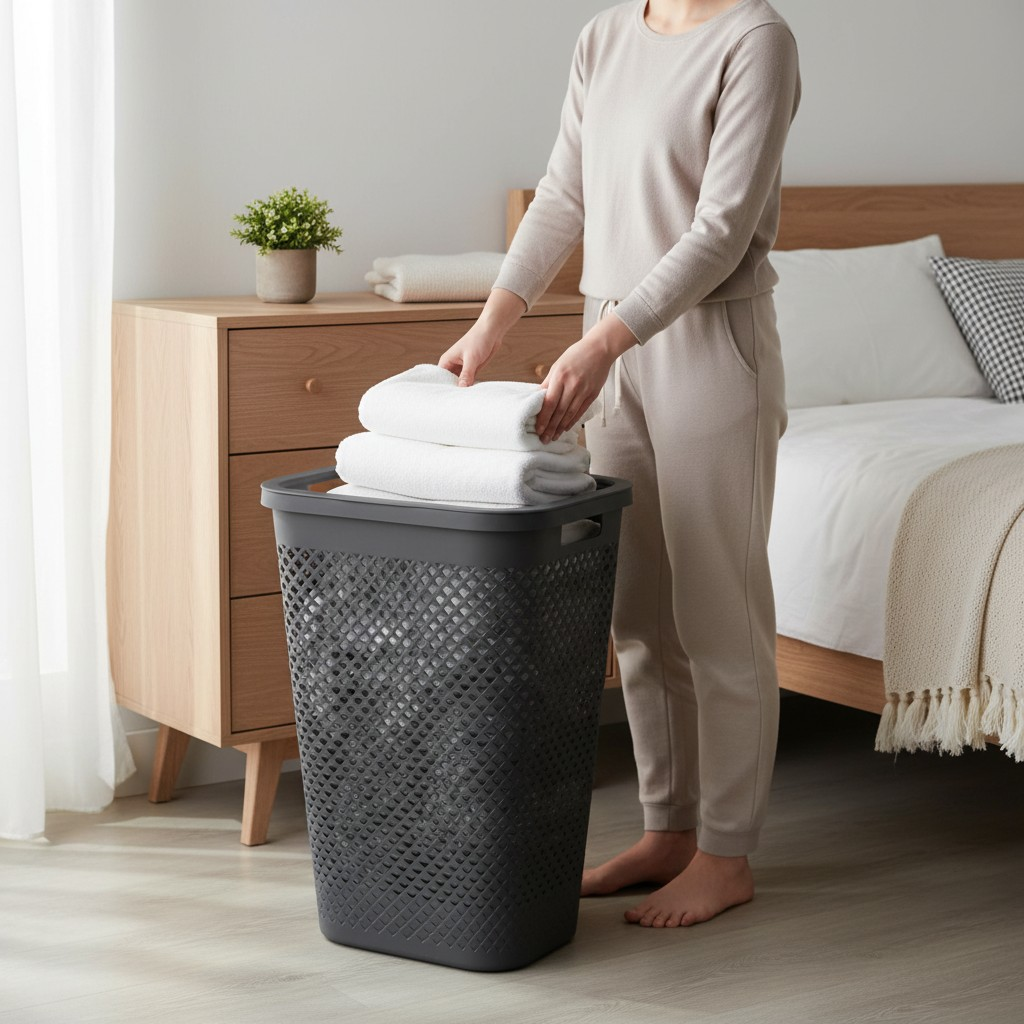 A strapabíróbb műanyag kialakítás ellenáll a mindennapi használat során fellépő igénybevételnek, miközben könnyen tisztán tartható. Méretének köszönhetően elegendő helyet biztosít a szennyes ruhák rendszerezett gyűjtéséhez.