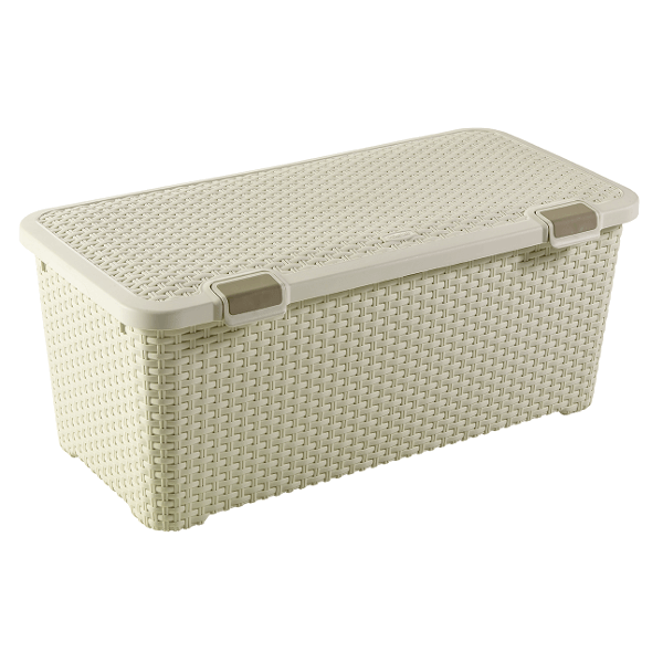 72 literes, krém színű rattan hatású tároló, nagy méretű, rattan stílusú tároló láda, mely ideális ágyneműnk és egyéb háztartási cikkekeink elrejtésére. Nem csak rendszerezésre, tárolásra alkalmas, de szobánk díszévé is válhat különleges rattan felületének köszönhetően, továbbá a termék hatékonyan biztosítja a helyiség rendjét annak köszönhetően, hogy a láda csatos fedéllel van ellátva, így elrejti azt, amit tárolni szeretnénk benne.