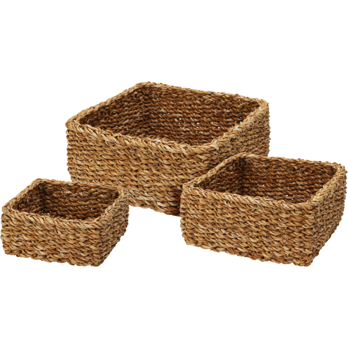 Három darabos tengerifű kosárszett 18-22-26 cm méretekben. Natúr színével harmóniát teremt, behozza a természetet a mindennapokba. Önmagában is díszíti a teret; nemcsak otthon, de például az irodában is jól mutat.