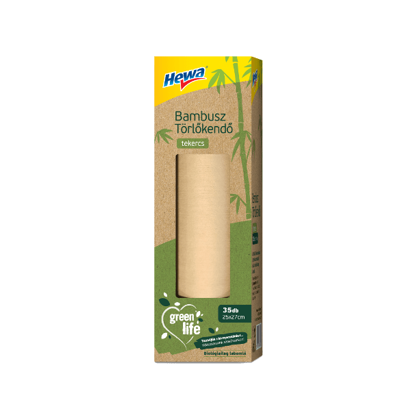 HEWA Green Life 100 % bambusz törlőkendők tekercsben. Biológiailag lebomló kendők. Rendkívül puha és nedvszívó. Tökéletesen tisztít, nem hagy nyomot. Kézzel mosható, ezért többször is használható. Bármilyen felület tisztításához ideális (pl. konyhapult, bútorok, edények). Tiszteljük a környezetünket! Változtassunk szokásainkon! A csomagolás újrahasznosítható, ezért használat után ne felejtse el a kijelölt gyűjtőedénybe helyezni.