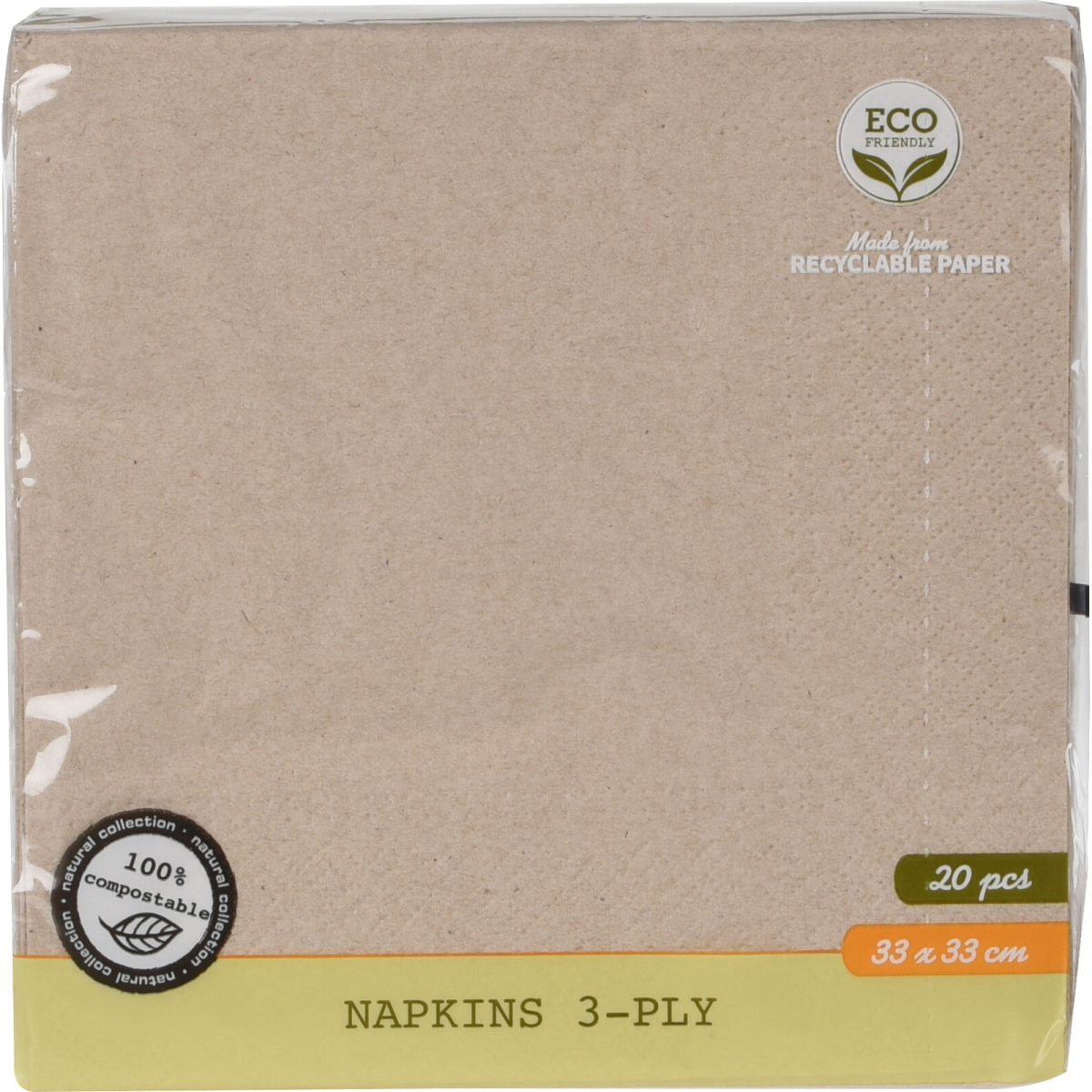 20 darab újrahasznosított anyagokból készült szalvétát tartalmazó csomag. Mérete: 33x33 cm.