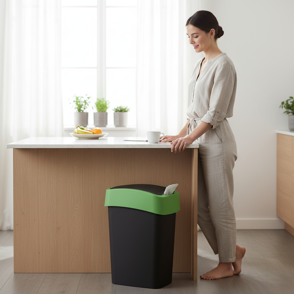 A Curver Pacific Flip Bin 25 literes szemetes ideális megoldás a mindennapi háztartási hulladék higiénikus gyűjtéséhez. A fekete–zöld színkombináció modern megjelenést ad, a kézzel működtethető billenő fedél pedig elrejti a tartalmat és segít mérsékelni a kellemetlen szagok kiáramlását. A termék 80%-ban újrahasznosított műanyagból készül, így környezetkímélőbb választás.