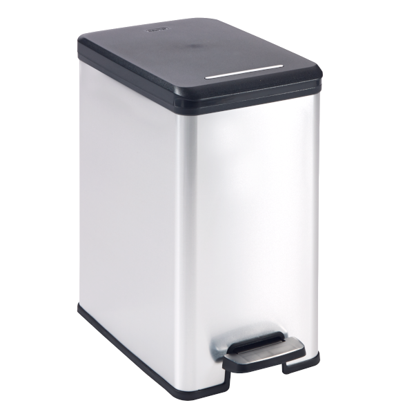 Funkcionális szemetes a fürdőszoba vagy a konyha könnyebb tisztántartása eléréséért. Tökéletesen illik a modern kialakítású fürdőszobákba és konyhákba. Kíváló minőségű műanyagból készült, valamint a metálfény fólia bevonat biztosítja a fém érzetet, de mégis könnyű marad. A hulladéktároló nyitása lábbal, egy speciális pedállal történik, így a kezek tiszták maradnak. A fedél szerkezete biztosítja a kosár tartalmának folyamatosan elzárt és láthatatlan tárolását. A vékony forma megkönnyíti a szemetes esztétikus elhelyezését a belső terekben.