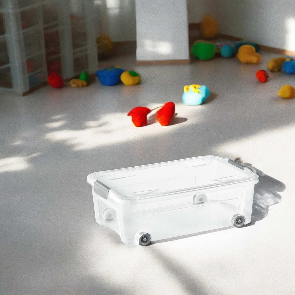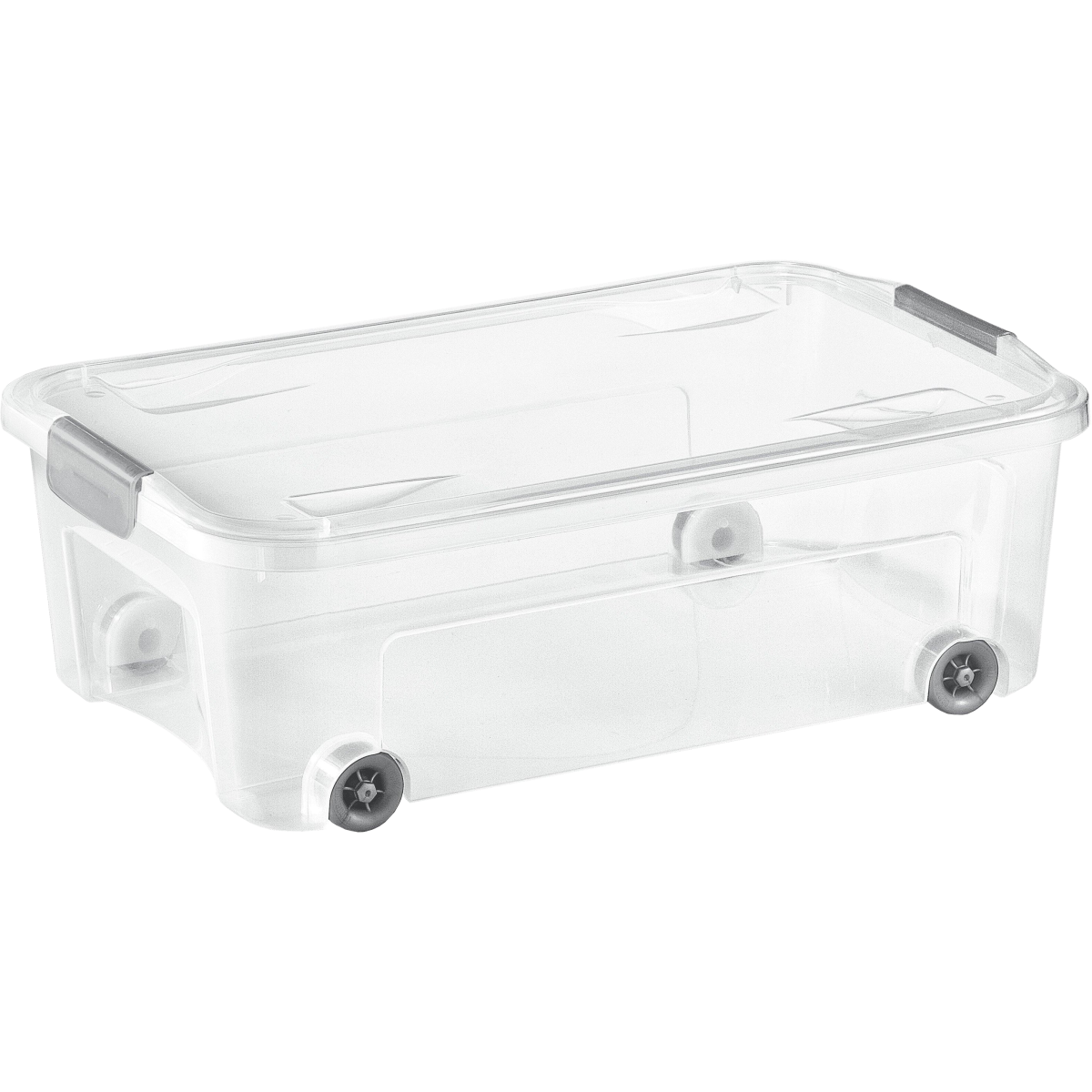 Kombi doboz moduláris felpattintható fedéllel. Az átlátszó felületnek köszönhetően jól látható, mi van benne, a fogantyúk és kerekek pedig megkönnyítik a mozgatást.