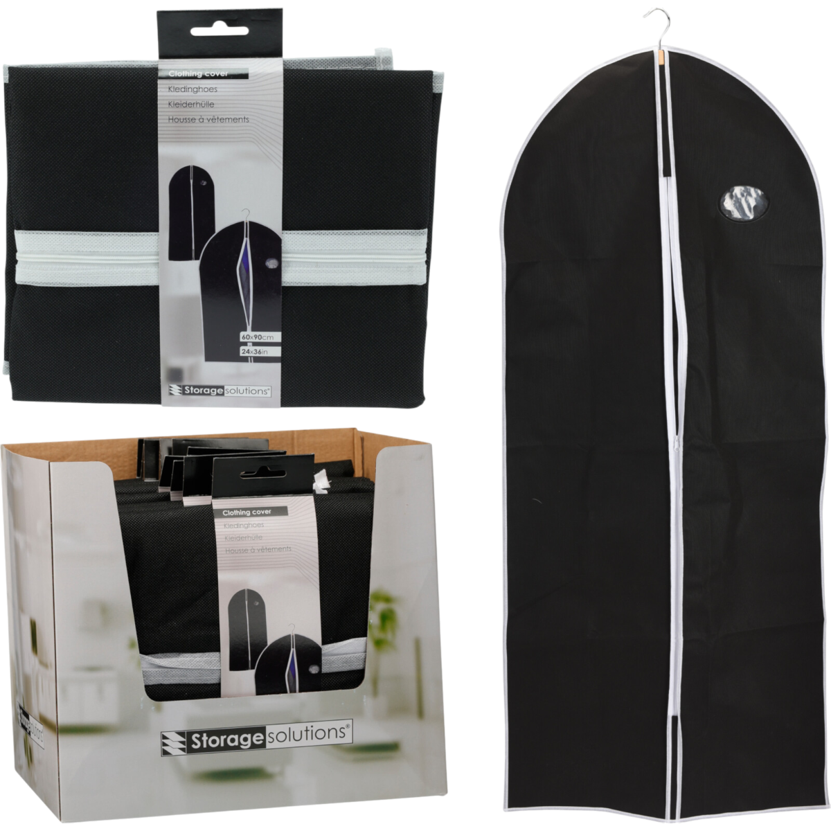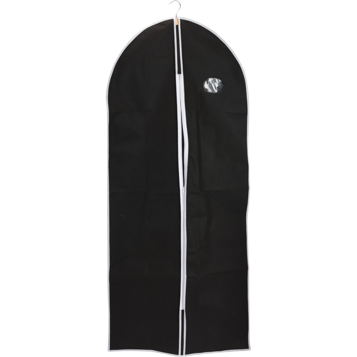 Az öltönytáska fekete színben, fehér szegélyekkel praktikus megoldás ruhák védett tárolására és szállítására. Letisztult megjelenése mellett a poliészter anyag segít megóvni a ruhadarabokat a portól és szennyeződésektől. Két különböző méretben érhető el, így az igényeidhez és a tárolt ruhák hosszához igazítható.