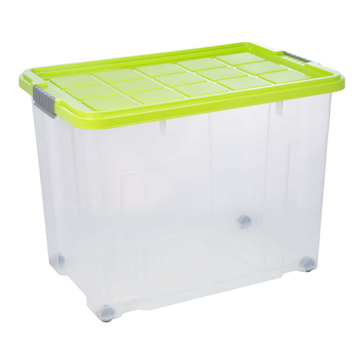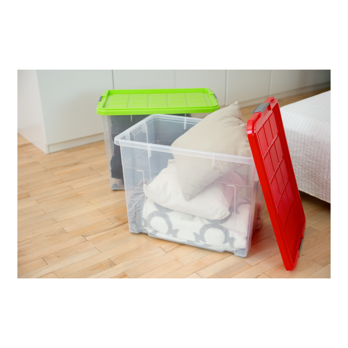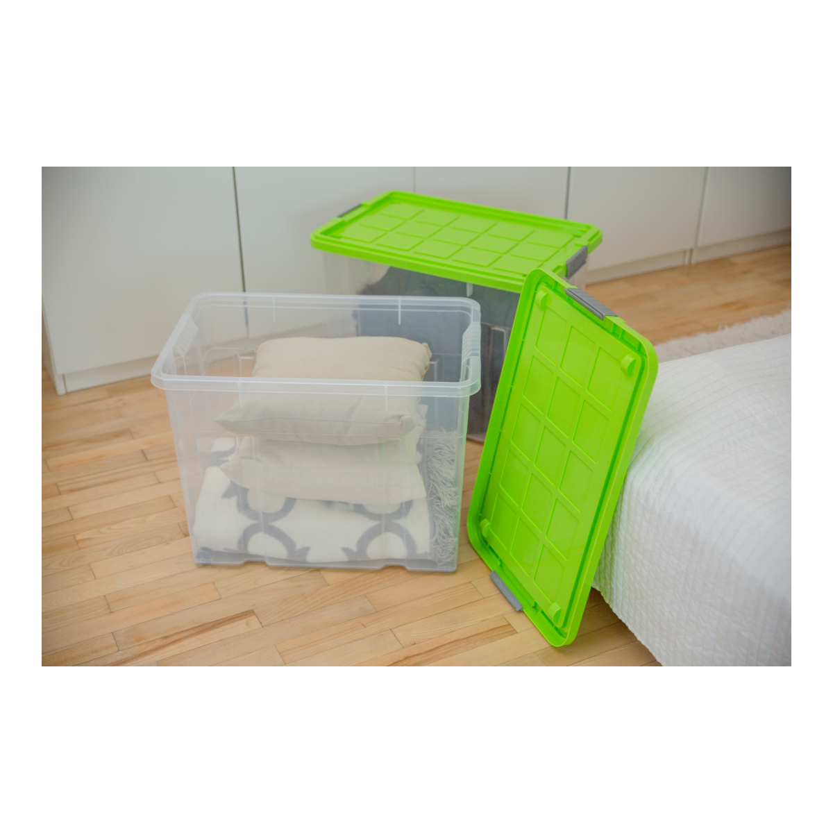 Tárolódoboz maxi fedéllel és kerékkel, 60,5x34x46 cm méretben, különböző színű lezárható tetővel.