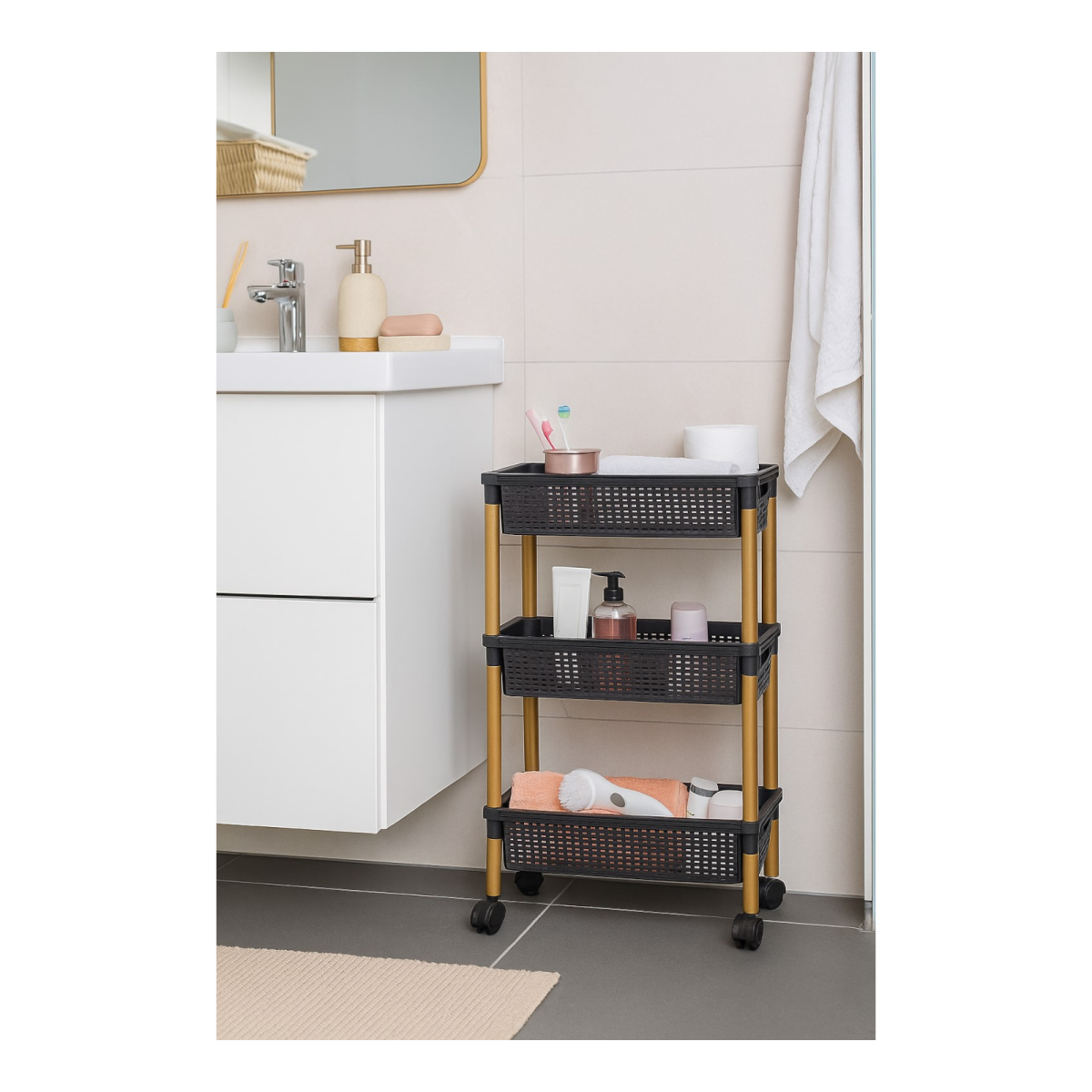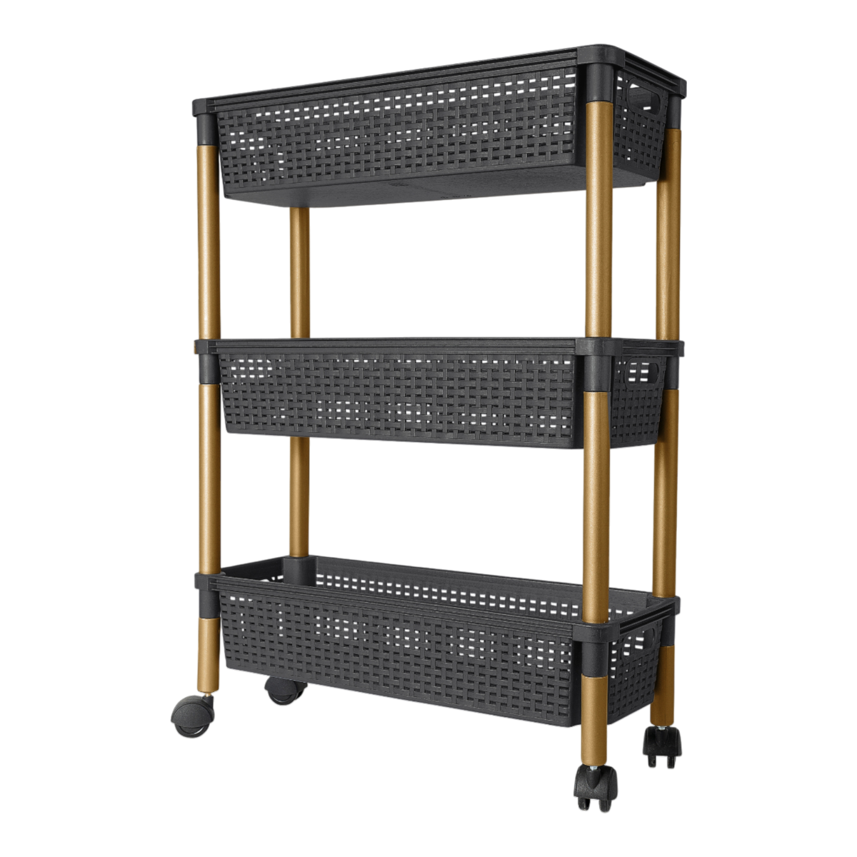 Ez a keskeny kialakítású, 3 szintes tárolókocsi hatékony segítség lehet fürdőszobában, konyhában vagy akár a kamrában. A rattan mintázatú PP műanyag tálcák esztétikus megjelenést adnak, a négy kerék pedig könnyű mozgatást tesz lehetővé. A kompakt forma ideális akkor, ha kevés a szabad hely, de szükség van rendezett tárolófelületre.