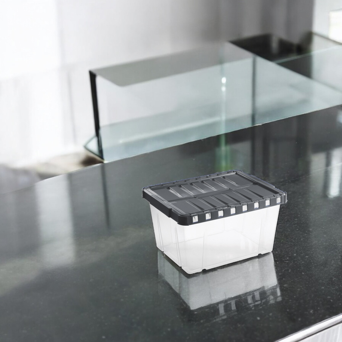 Műanyag, dupla vonalú tároló doboz pillangós fedéllel.